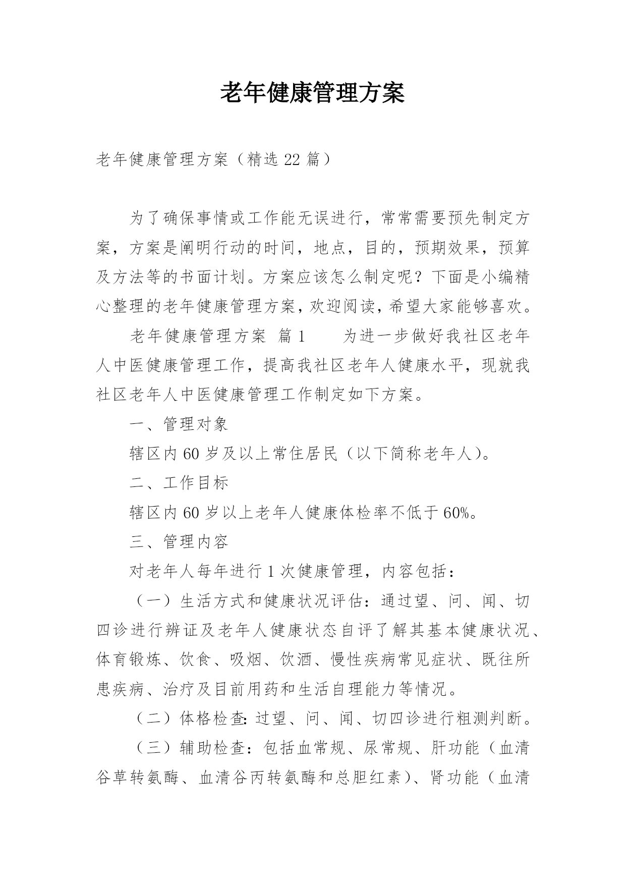 老年健康管理方案老年健康管理方案(精选22篇)为了确保事情或工作能无误进行,常常需要预先制定方案,方案是阐明行动的时间,地点,目的,预期效果,预算及方法等的书面计划。方案应该怎么制定呢?下面是小编精心整理的老年健康管理方案,欢迎阅读,希望大家能够喜欢。老年健康管理方案篇1为进一步做好我社区老年人中医健康管理工作,提高我社区老年人健康水平,现就我社区老年人中医健康管理工作制定如下方案。一、管理对象辖区内60岁及以上常住居民(以下简称老年人)。二、工作目标辖区内60岁以上老年人健康体检率不低于60%。三、管理