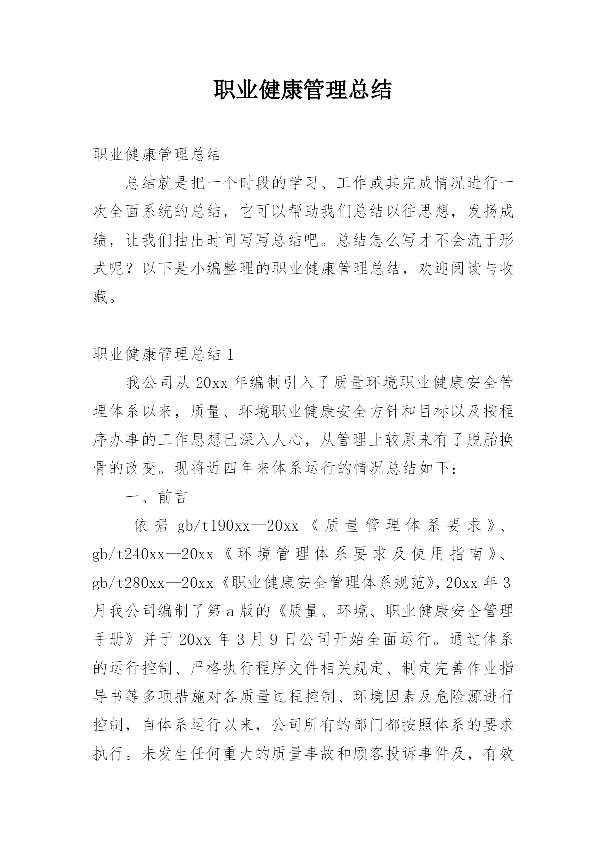 职业健康管理总结职业健康管理总结总结就是把一个时段的学习、工作或其完成情况进行一次全面系统的总结,它可以帮助我们总结以往思想,发扬成绩,让我们抽出时间写写总结吧。总结怎么写才不会流于形式呢?以下是小编整理的职业健康管理总结,欢迎阅读与收藏。职业健康管理总结1我公司从20xx年编制引入了质量环境职业健康安全管理体系以来,质量、环境职业健康安全方针和目标以及按程序办事的工作思想已深入人心,从管理上较原来有了脱胎换骨的改变。现将近四年来体系运行的情况总结如下:一、前言依据gb/t190xx—20xx《质量管理体