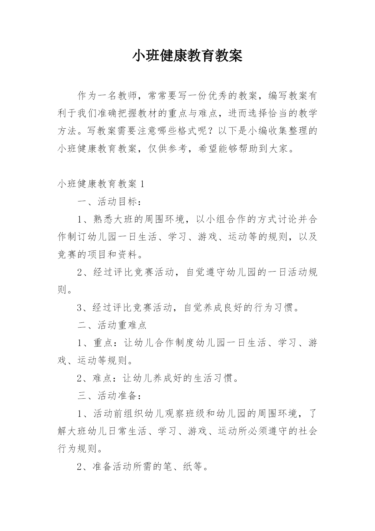 小班健康教育教案作为一名教师,常常要写一份优秀的教案,编写教案有利于我们准确把握教材的重点与难点,进而选择恰当的教学方法。写教案需要注意哪些格式呢?以下是小编收集整理的小班健康教育教案,仅供参考,希望能够帮助到大家。小班健康教育教案1一、活动目标:1、熟悉大班的周围环境,以小组合作的方式讨论并合作制订幼儿园一日生活、学习、游戏、运动等的规则,以及竞赛的项目和资料。2、经过评比竞赛活动,自觉遵守幼儿园的一日活动规则。3、经过评比竞赛活动,自觉养成良好的行为习惯。二、活动重难点1、重点:让幼儿合作制度幼儿园一