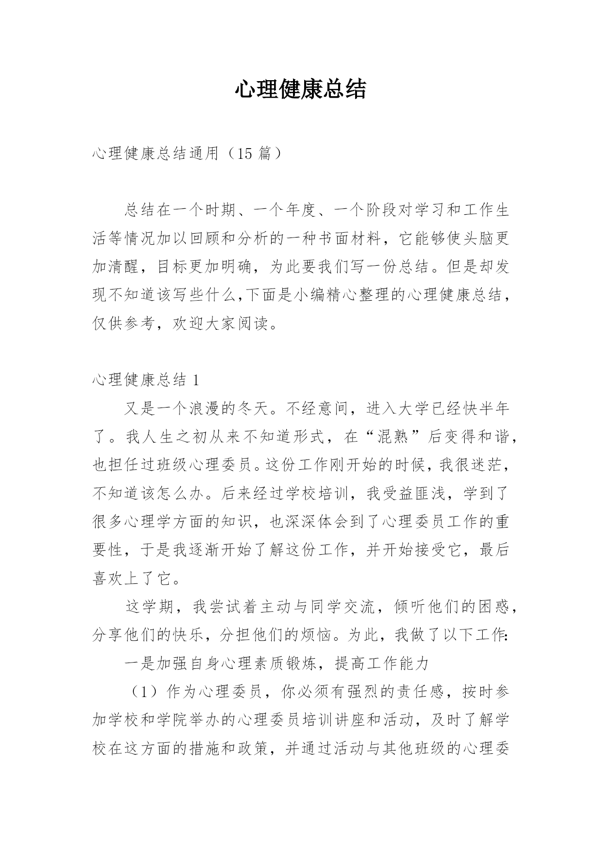 心理健康总结心理健康总结通用(15篇)总结在一个时期、一个年度、一个阶段对学习和工作生活等情况加以回顾和分析的一种书面材料,它能够使头脑更加清醒,目标更加明确,为此要我们写一份总结。但是却发现不知道该写些什么,下面是小编精心整理的心理健康总结,仅供参考,欢迎大家阅读。心理健康总结1又是一个浪漫的冬天。不经意间,进入大学已经快半年了。我人生之初从来不知道形式,在“混熟”后变得和谐,也担任过班级心理委员。这份工作刚开始的时候,我很迷茫,不知道该怎么办。后来经过学校培训,我受益匪浅,学到了很多心理学方面的知识,