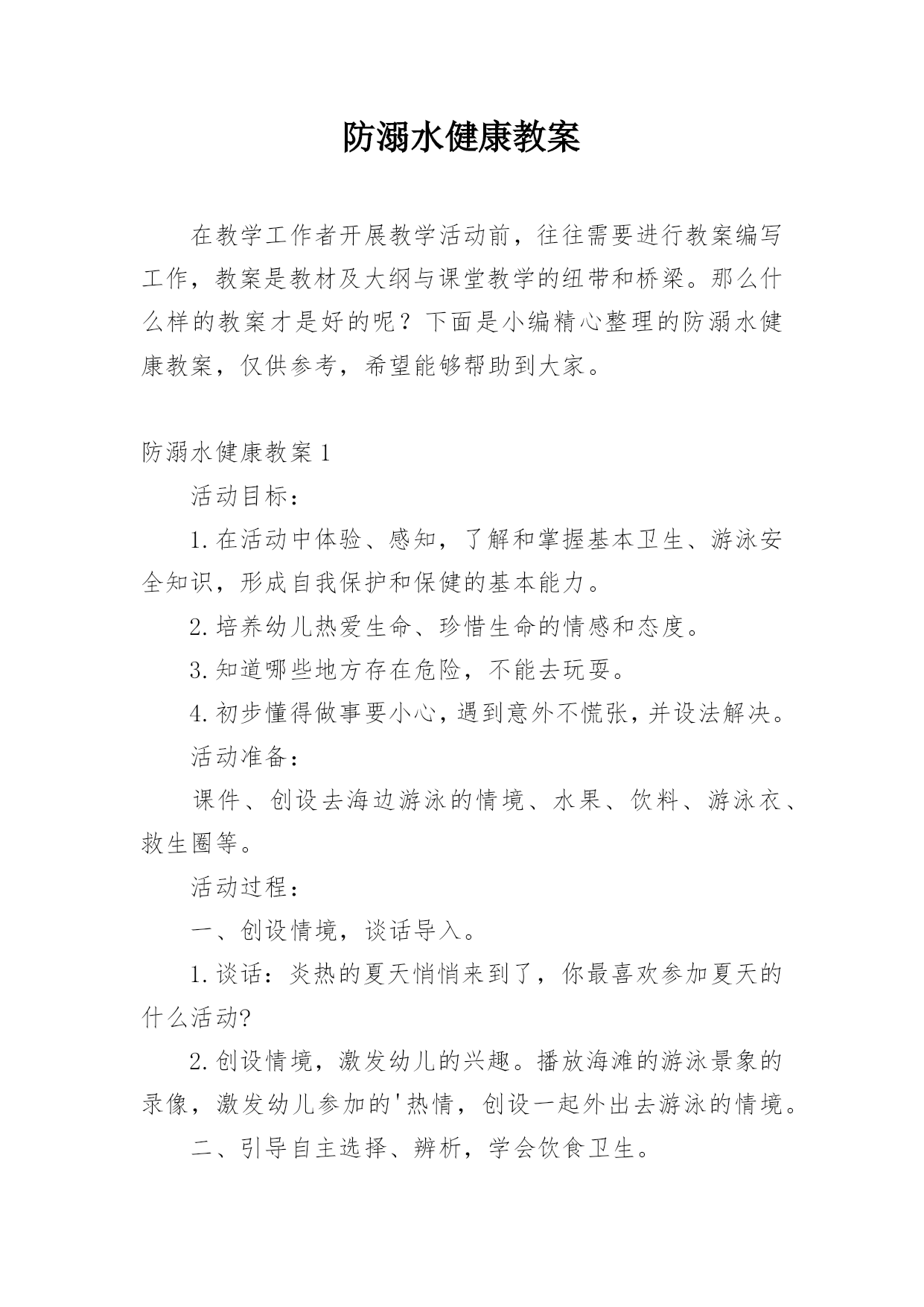 防溺水健康教案在教学工作者开展教学活动前,往往需要进行教案编写工作,教案是教材及大纲与课堂教学的纽带和桥梁。那么什么样的教案才是好的呢?下面是小编精心整理的防溺水健康教案,仅供参考,希望能够帮助到大家。防溺水健康教案1活动目标:1.在活动中体验、感知,了解和掌握基本卫生、游泳安全知识,形成自我保护和保健的基本能力。2.培养幼儿热爱生命、珍惜生命的情感和态度。3.知道哪些地方存在危险,不能去玩耍。4.初步懂得做事要小心,遇到意外不慌张,并设法解决。活动准备:课件、创设去海边游泳的情境、水果、饮料、游泳衣、救