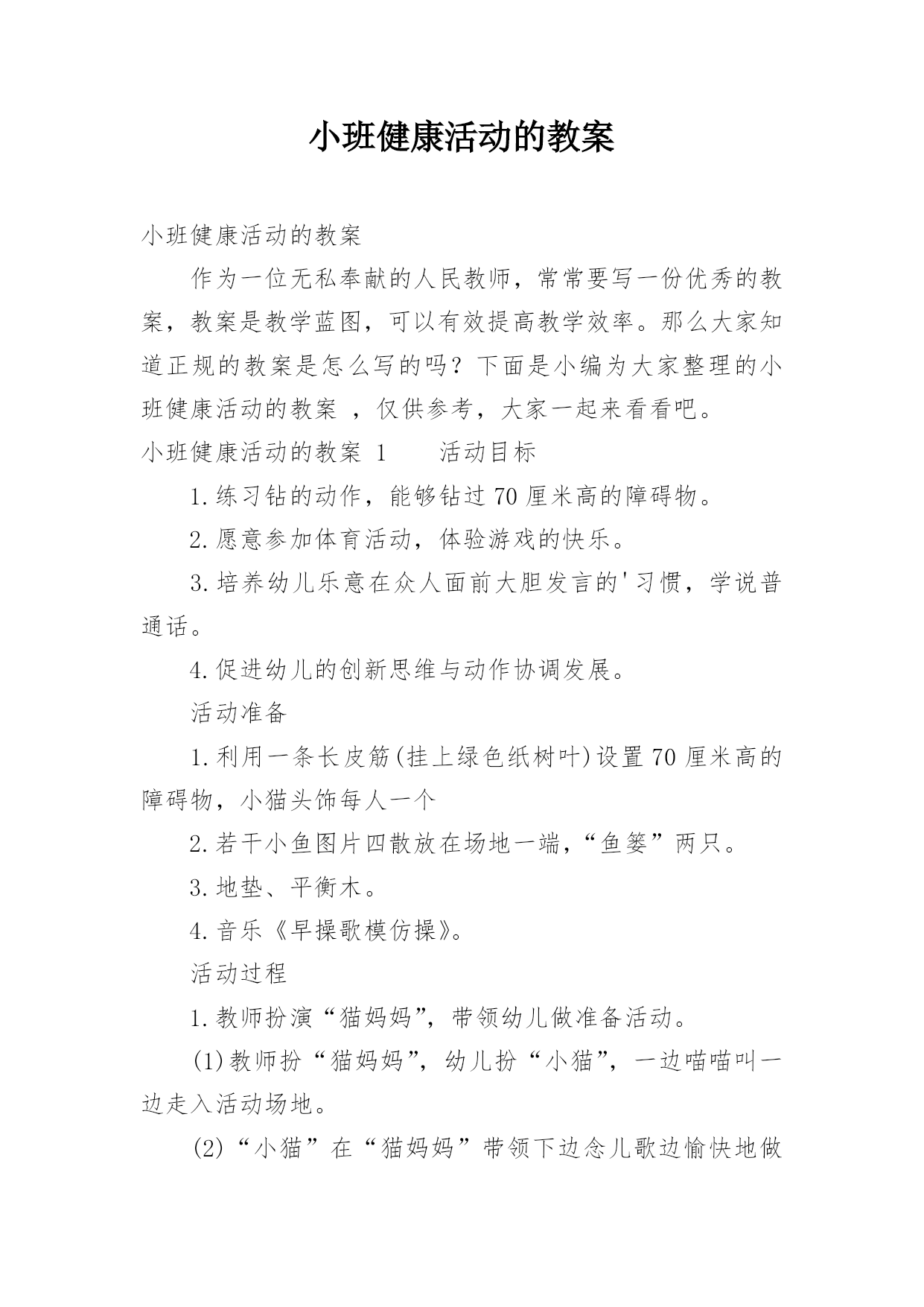 小班健康活动的教案小班健康活动的教案作为一位无私奉献的人民教师,常常要写一份优秀的教案,教案是教学蓝图,可以有效提高教学效率。那么大家知道正规的教案是怎么写的吗?下面是小编为大家整理的小班健康活动的教案,仅供参考,大家一起来看看吧。小班健康活动的教案1活动目标1.练习钻的动作,能够钻过70厘米高的障碍物。2.愿意参加体育活动,体验游戏的快乐。3.培养幼儿乐意在众人面前大胆发言的'习惯,学说普通话。4.促进幼儿的创新思维与动作协调发展。活动准备1.利用一条长皮筋(挂上绿色纸树叶)设置70厘米高的障碍物,小猫