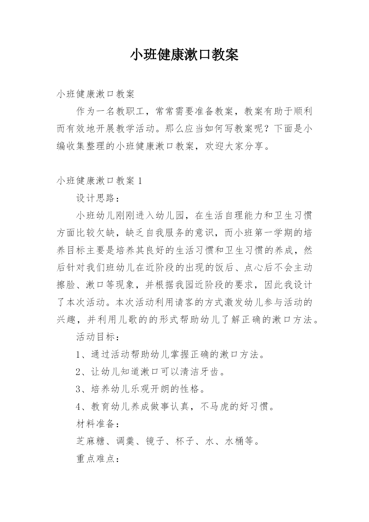小班健康漱口教案小班健康漱口教案作为一名教职工,常常需要准备教案,教案有助于顺利而有效地开展教学活动。那么应当如何写教案呢?下面是小编收集整理的小班健康漱口教案,欢迎大家分享。小班健康漱口教案1设计思路:小班幼儿刚刚进入幼儿园,在生活自理能力和卫生习惯方面比较欠缺,缺乏自我服务的意识,而小班第一学期的培养目标主要是培养其良好的生活习惯和卫生习惯的养成,然后针对我们班幼儿在近阶段的出现的饭后、点心后不会主动擦脸、漱口等现象,并根据我园近阶段的要求,因此我设计了本次活动。本次活动利用请客的方式激发幼儿参与活动