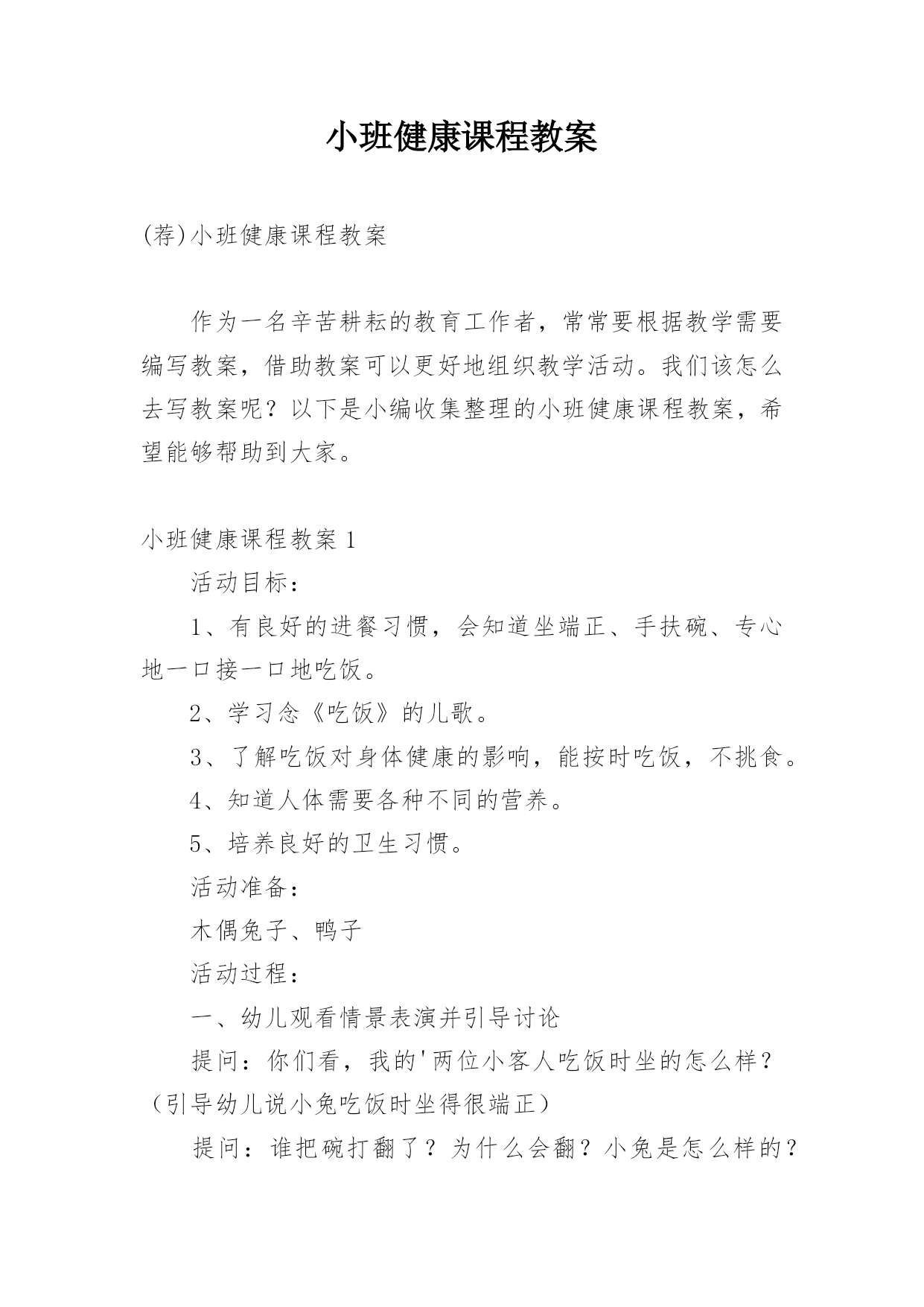 小班健康课程教案(荐)小班健康课程教案作为一名辛苦耕耘的教育工作者,常常要根据教学需要编写教案,借助教案可以更好地组织教学活动。我们该怎么去写教案呢?以下是小编收集整理的小班健康课程教案,希望能够帮助到大家。小班健康课程教案1活动目标:1、有良好的进餐习惯,会知道坐端正、手扶碗、专心地一口接一口地吃饭。2、学习念《吃饭》的儿歌。3、了解吃饭对身体健康的影响,能按时吃饭,不挑食。4、知道人体需要各种不同的营养。5、培养良好的卫生习惯。活动准备:木偶兔子、鸭子活动过程:一、幼儿观看情景表演并引导讨论提问:你们