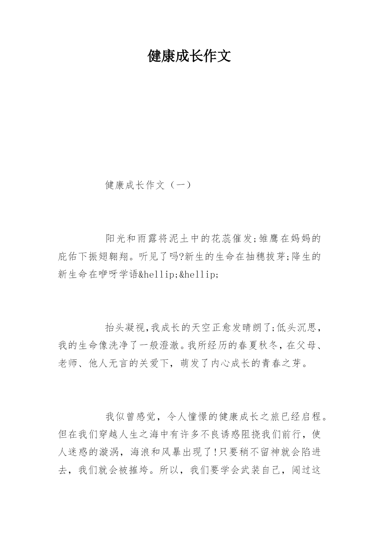 健康成长作文健康成长作文(一)阳光和雨露将泥土中的花蕊催发;雏鹰在妈妈的庇佑下振翅翱翔。听见了吗?新生的生命在抽穗拔芽;降生的新生命在咿呀学语……抬头凝视,我成长的天空正愈发晴朗了;低头沉思,我的生命像洗净了一般澄澈。我所经历的春夏秋冬,在父母、老师、他人无言的关爱下,萌发了内心成长的青春之芽。我似曾感觉,令人憧憬的健康成长之旅已经启程。但在我们穿越人生之海中有许多不良诱惑阻挠我们前行,使人迷惑的漩涡,海浪和风暴出现了!只要稍不留神就会陷进去,我们就会被摧垮。所以,我们要学会武