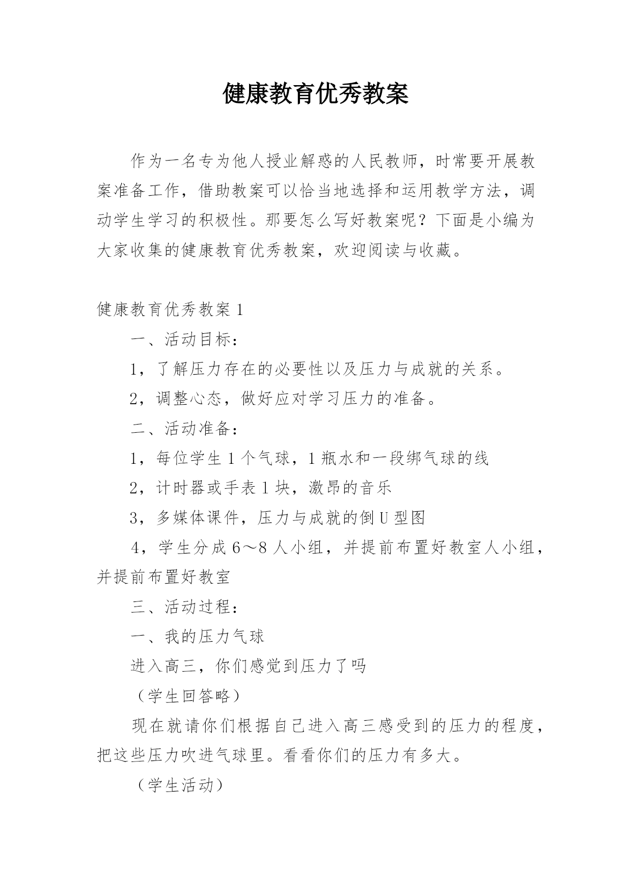 健康教育优秀教案作为一名专为他人授业解惑的人民教师,时常要开展教案准备工作,借助教案可以恰当地选择和运用教学方法,调动学生学习的积极性。那要怎么写好教案呢?下面是小编为大家收集的健康教育优秀教案,欢迎阅读与收藏。健康教育优秀教案1一、活动目标:1,了解压力存在的必要性以及压力与成就的关系。2,调整心态,做好应对学习压力的准备。二、活动准备:1,每位学生1个气球,1瓶水和一段绑气球的线2,计时器或手表l块,激昂的音乐3,多媒体课件,压力与成就的倒U型图4,学生分成6~8人小组,并提前布置好教室人小组,并提前