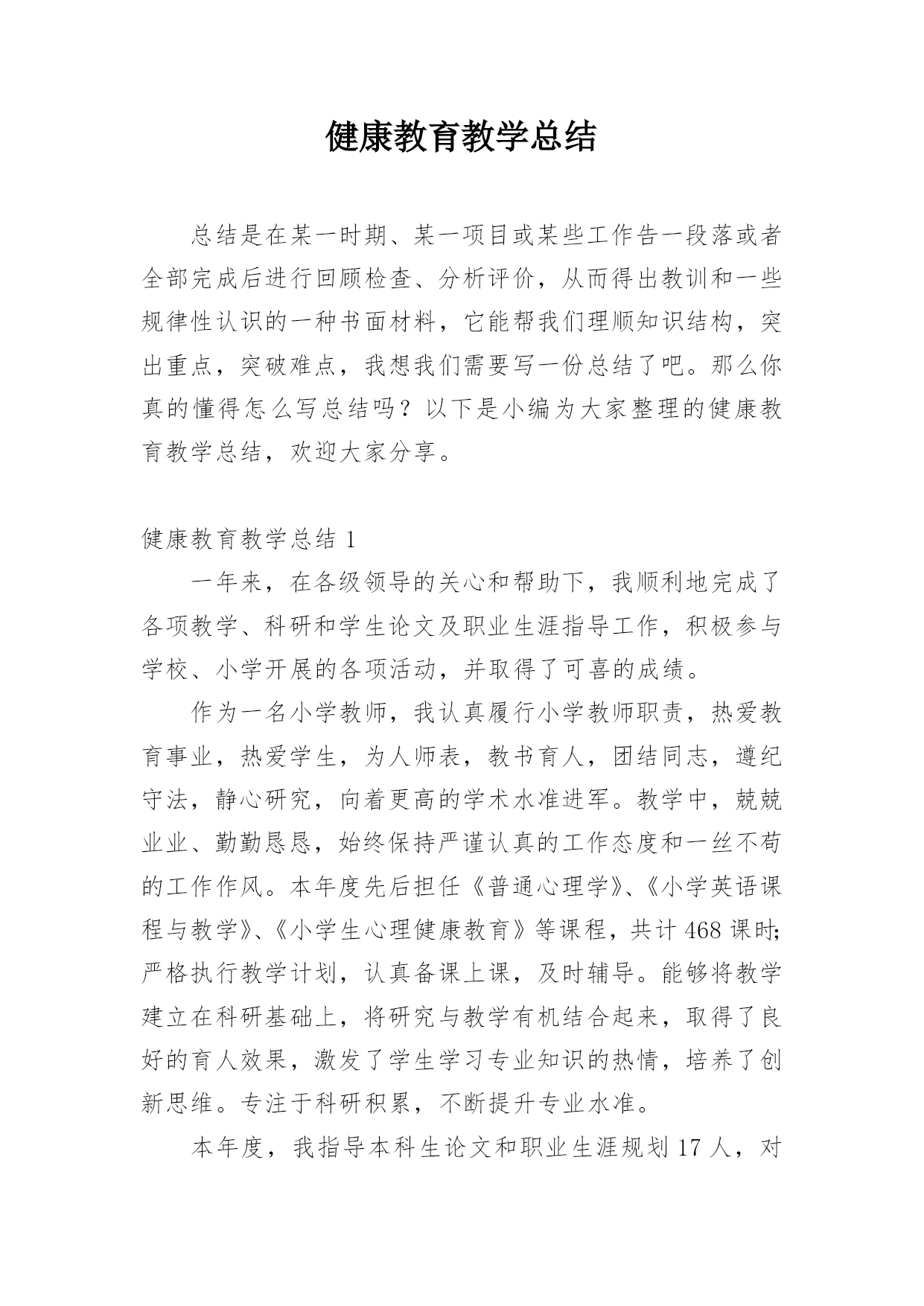 健康教育教学总结总结是在某一时期、某一项目或某些工作告一段落或者全部完成后进行回顾检查、分析评价,从而得出教训和一些规律性认识的一种书面材料,它能帮我们理顺知识结构,突出重点,突破难点,我想我们需要写一份总结了吧。那么你真的懂得怎么写总结吗?以下是小编为大家整理的健康教育教学总结,欢迎大家分享。健康教育教学总结1一年来,在各级领导的关心和帮助下,我顺利地完成了各项教学、科研和学生论文及职业生涯指导工作,积极参与学校、小学开展的各项活动,并取得了可喜的成绩。作为一名小学教师,我认真履行小学教师职责,热爱教育