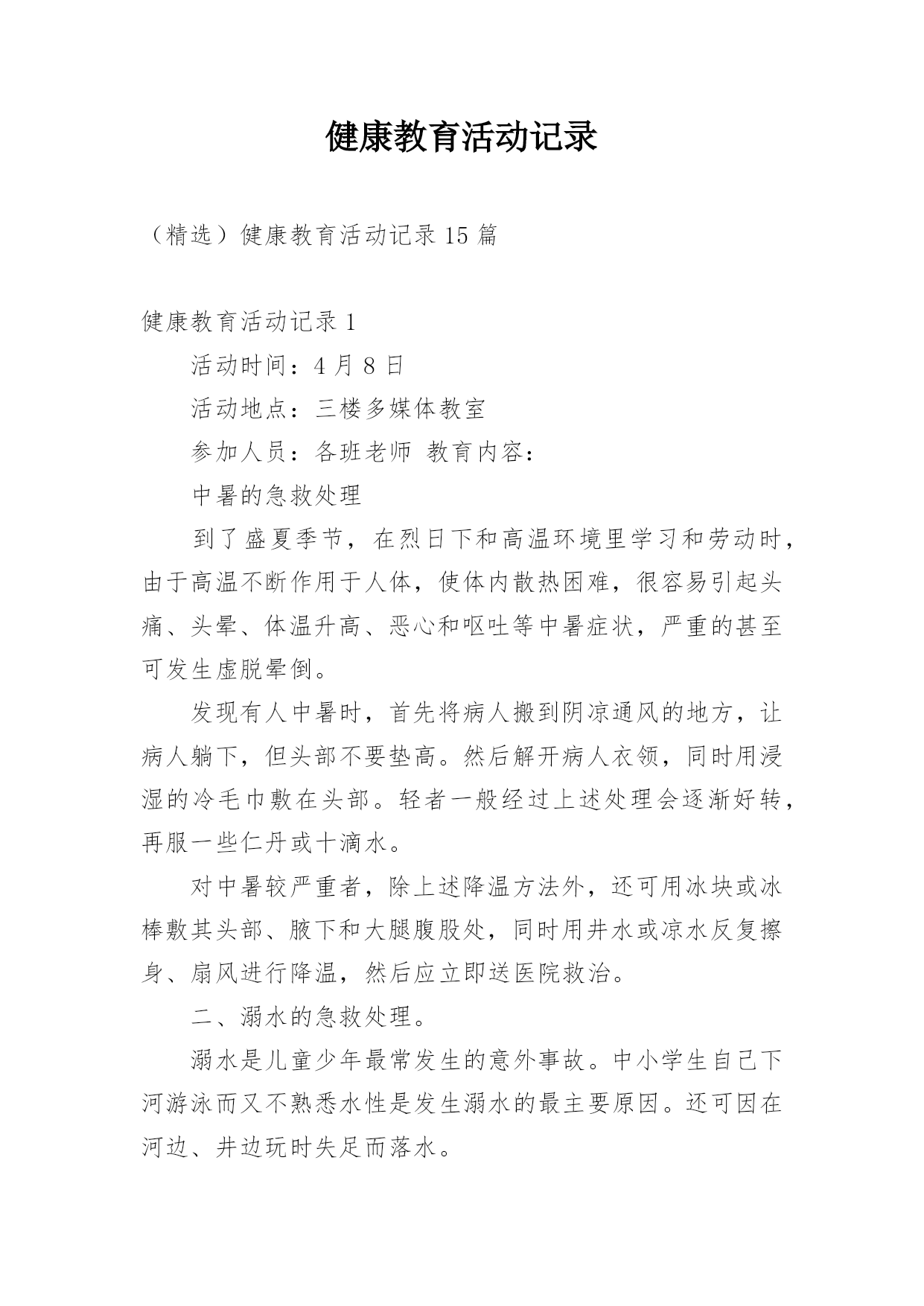 健康教育活动记录(精选)健康教育活动记录15篇健康教育活动记录1活动时间:4月8日活动地点:三楼多媒体教室参加人员:各班老师教育内容:中暑的急救处理到了盛夏季节,在烈日下和高温环境里学习和劳动时,由于高温不断作用于人体,使体内散热困难,很容易引起头痛、头晕、体温升高、恶心和呕吐等中暑症状,严重的甚至可发生虚脱晕倒。发现有人中暑时,首先将病人搬到阴凉通风的地方,让病人躺下,但头部不要垫高。然后解开病人衣领,同时用浸湿的冷毛巾敷在头部。轻者一般经过上述处理会逐渐好转,再服一些仁丹或十滴水。对中暑较严重者,除上