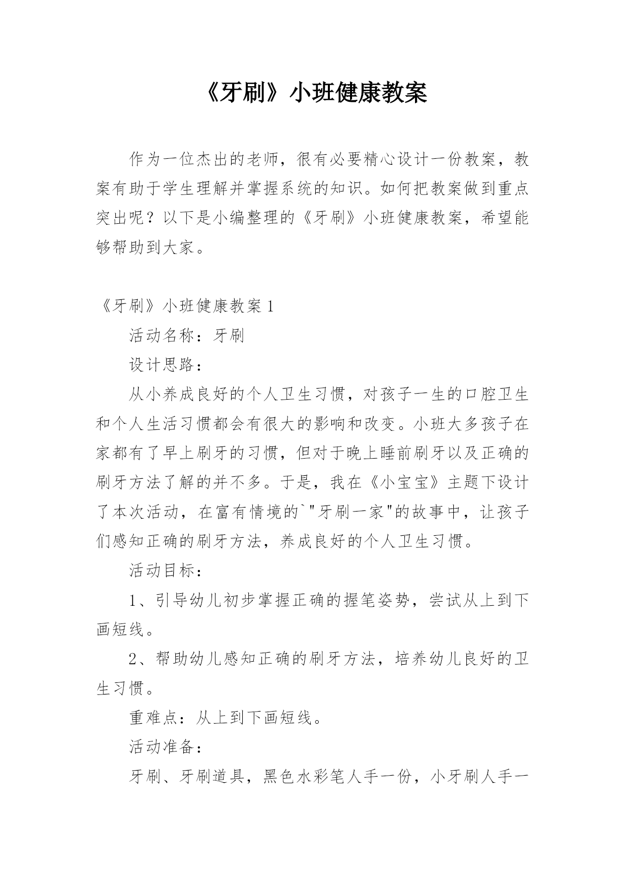 《牙刷》小班健康教案作为一位杰出的老师,很有必要精心设计一份教案,教案有助于学生理解并掌握系统的知识。如何把教案做到重点突出呢?以下是小编整理的《牙刷》小班健康教案,希望能够帮助到大家。《牙刷》小班健康教案1活动名称:牙刷设计思路:从小养成良好的个人卫生习惯,对孩子一生的口腔卫生和个人生活习惯都会有很大的影响和改变。小班大多孩子在家都有了早上刷牙的习惯,但对于晚上睡前刷牙以及正确的刷牙方法了解的并不多。于是,我在《小宝宝》主题下设计了本次活动,在富有情境的`"牙刷一家"的故事中,让孩子们感知正确的刷牙方法