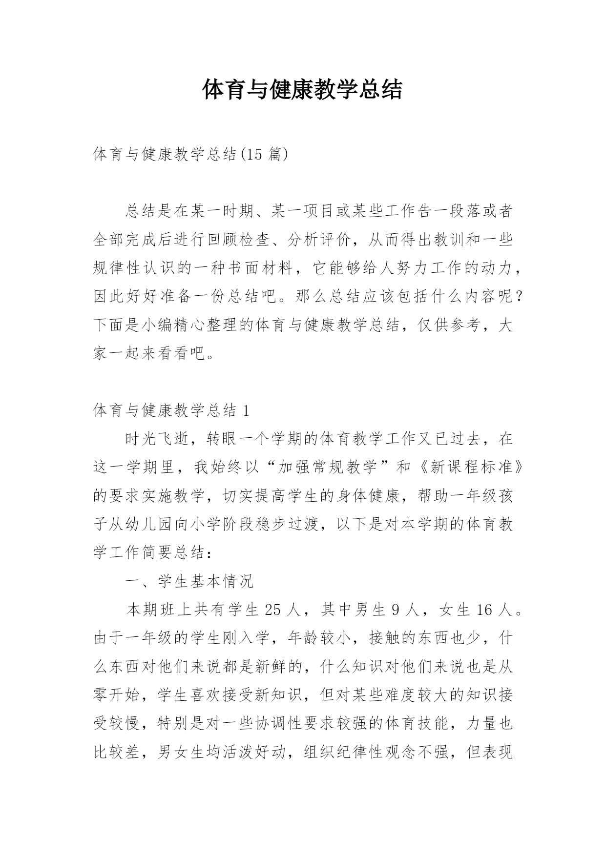 体育与健康教学总结体育与健康教学总结(15篇)总结是在某一时期、某一项目或某些工作告一段落或者全部完成后进行回顾检查、分析评价,从而得出教训和一些规律性认识的一种书面材料,它能够给人努力工作的动力,因此好好准备一份总结吧。那么总结应该包括什么内容呢?下面是小编精心整理的体育与健康教学总结,仅供参考,大家一起来看看吧。体育与健康教学总结1时光飞逝,转眼一个学期的体育教学工作又已过去,在这一学期里,我始终以“加强常规教学”和《新课程标准》的要求实施教学,切实提高学生的身体健康,帮助一年级孩子从幼儿园向小学阶段
