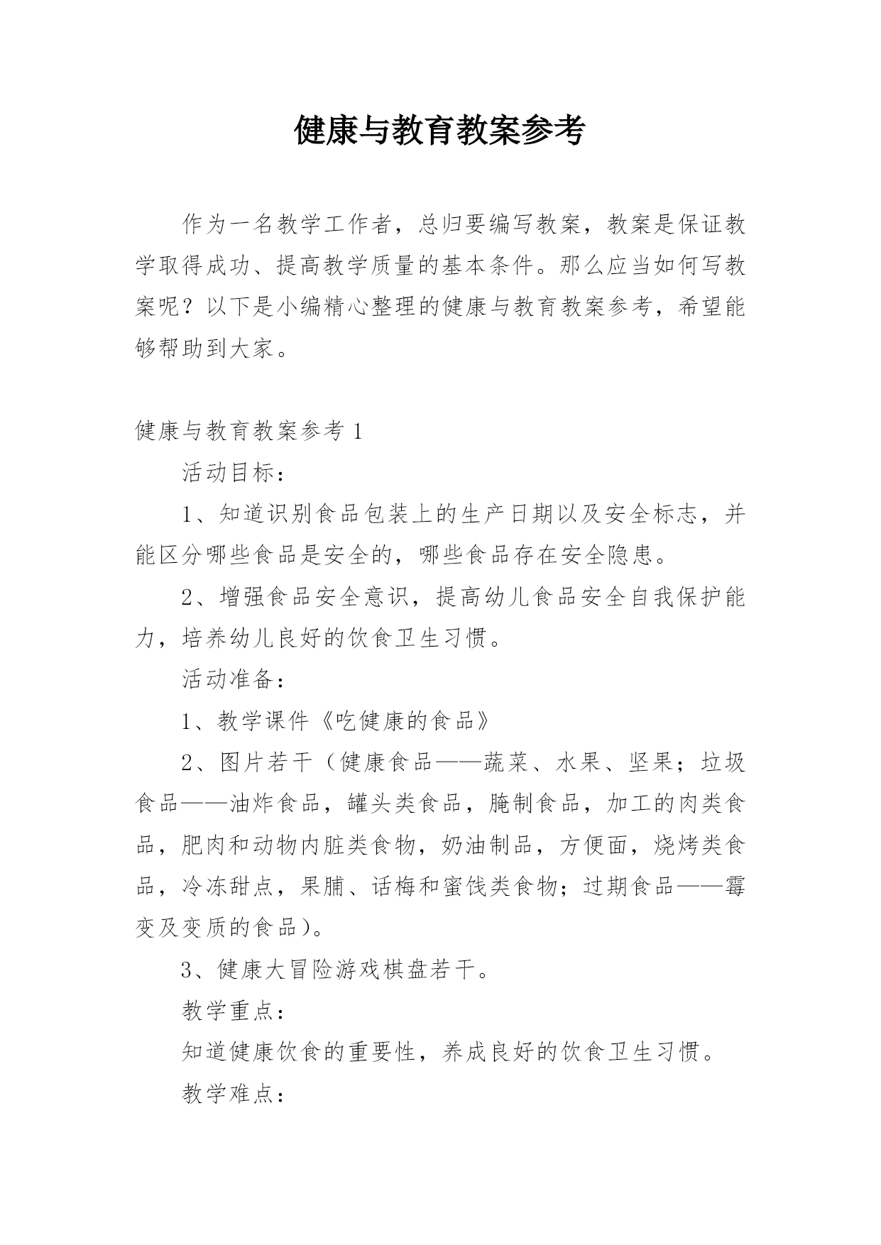 健康与教育教案参考作为一名教学工作者,总归要编写教案,教案是保证教学取得成功、提高教学质量的基本条件。那么应当如何写教案呢?以下是小编精心整理的健康与教育教案参考,希望能够帮助到大家。健康与教育教案参考1活动目标:1、知道识别食品包装上的生产日期以及安全标志,并能区分哪些食品是安全的,哪些食品存在安全隐患。2、增强食品安全意识,提高幼儿食品安全自我保护能力,培养幼儿良好的饮食卫生习惯。活动准备:1、教学课件《吃健康的食品》2、图片若干(健康食品——蔬菜、水果、坚果;垃圾食品——油炸食品,罐头类食品,腌制食