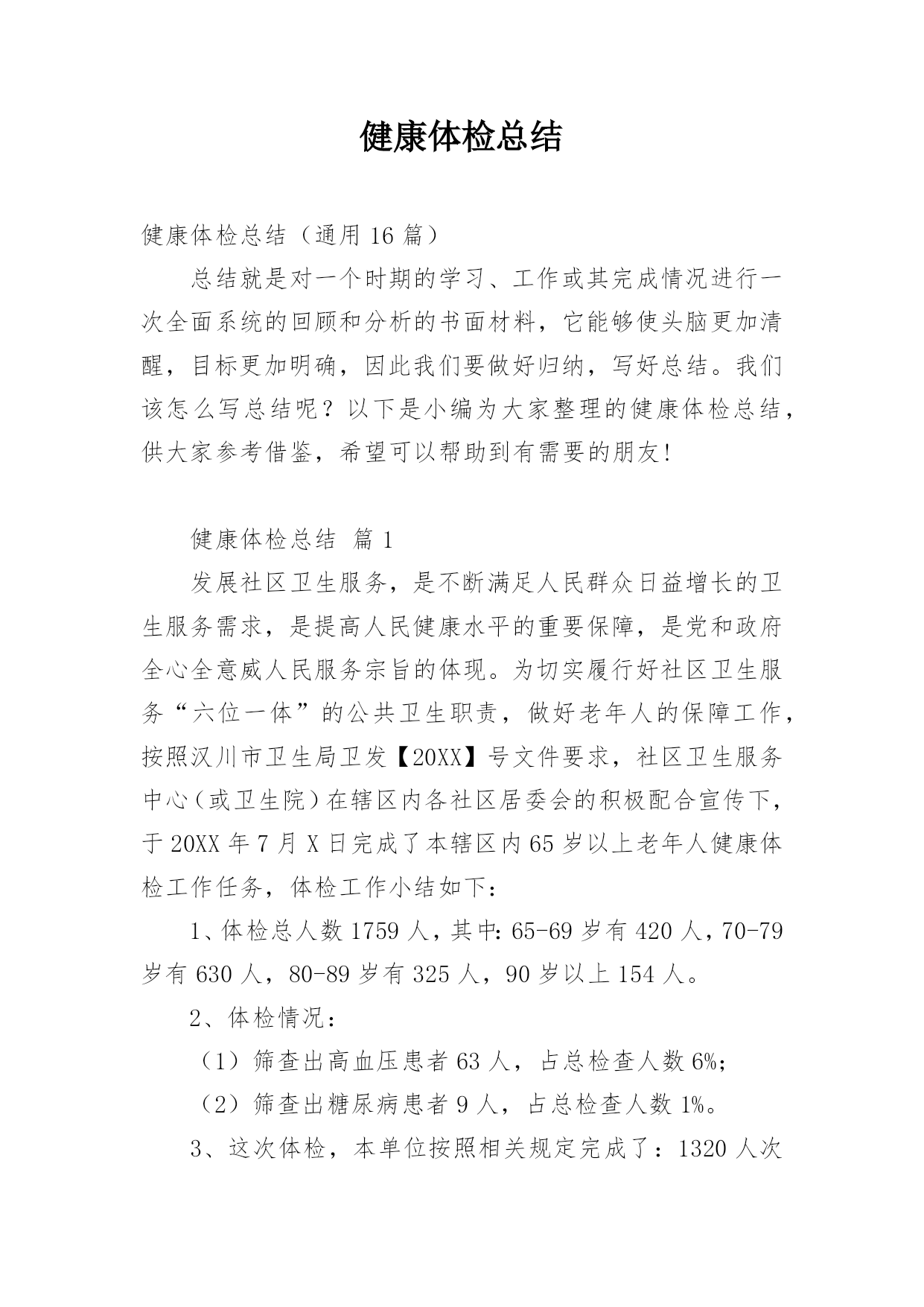 健康体检总结健康体检总结(通用16篇)总结就是对一个时期的学习、工作或其完成情况进行一次全面系统的回顾和分析的书面材料,它能够使头脑更加清醒,目标更加明确,因此我们要做好归纳,写好总结。我们该怎么写总结呢?以下是小编为大家整理的健康体检总结,供大家参考借鉴,希望可以帮助到有需要的朋友!健康体检总结篇1发展社区卫生服务,是不断满足人民群众日益增长的卫生服务需求,是提高人民健康水平的重要保障,是党和政府全心全意威人民服务宗旨的体现。为切实履行好社区卫生服务“六位一体”的公共卫生职责,做好老年人的保障工作,按照