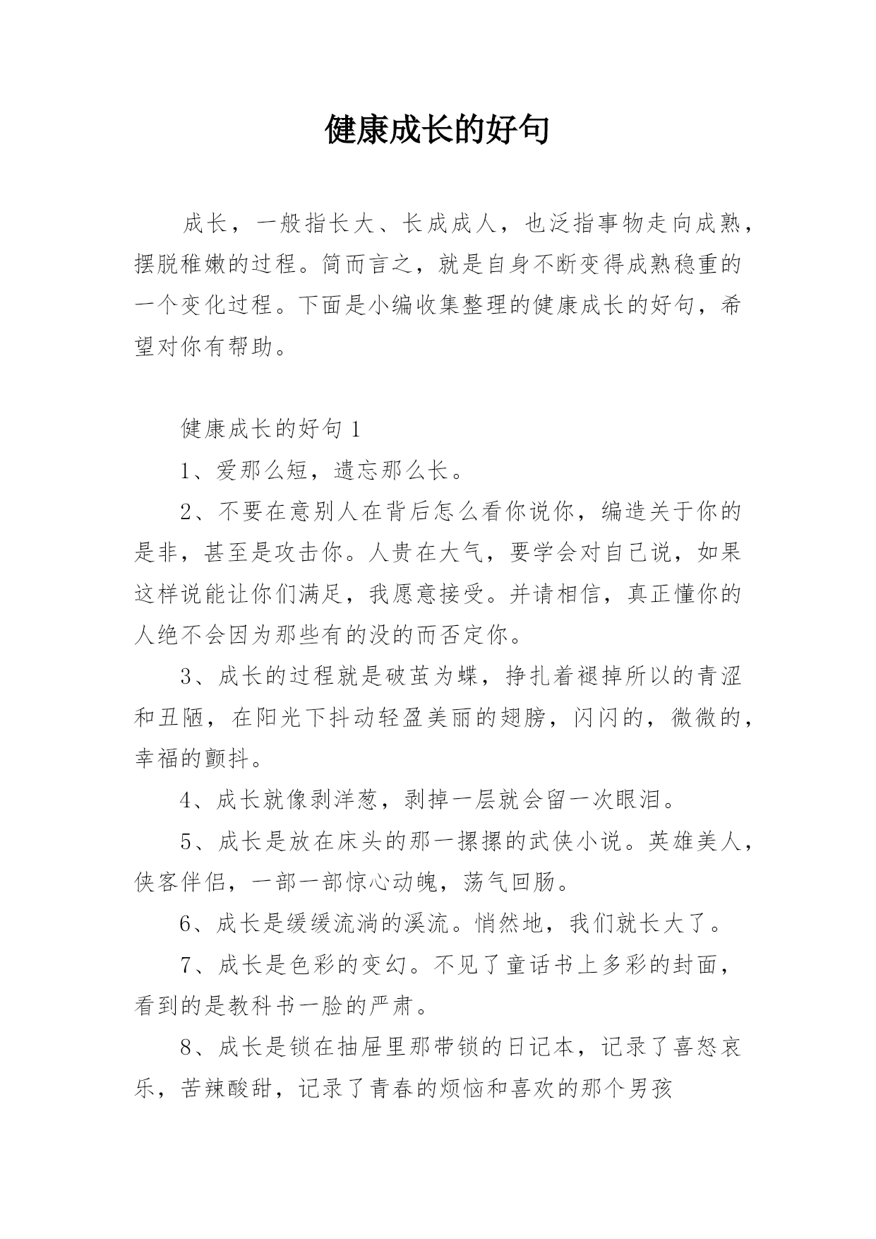 健康成长的好句成长,一般指长大、长成成人,也泛指事物走向成熟,摆脱稚嫩的过程。简而言之,就是自身不断变得成熟稳重的一个变化过程。下面是小编收集整理的健康成长的好句,希望对你有帮助。健康成长的好句11、爱那么短,遗忘那么长。2、不要在意别人在背后怎么看你说你,编造关于你的是非,甚至是攻击你。人贵在大气,要学会对自己说,如果这样说能让你们满足,我愿意接受。并请相信,真正懂你的人绝不会因为那些有的没的而否定你。3、成长的过程就是破茧为蝶,挣扎着褪掉所以的青涩和丑陋,在阳光下抖动轻盈美丽的翅膀,闪闪的,微微的,幸
