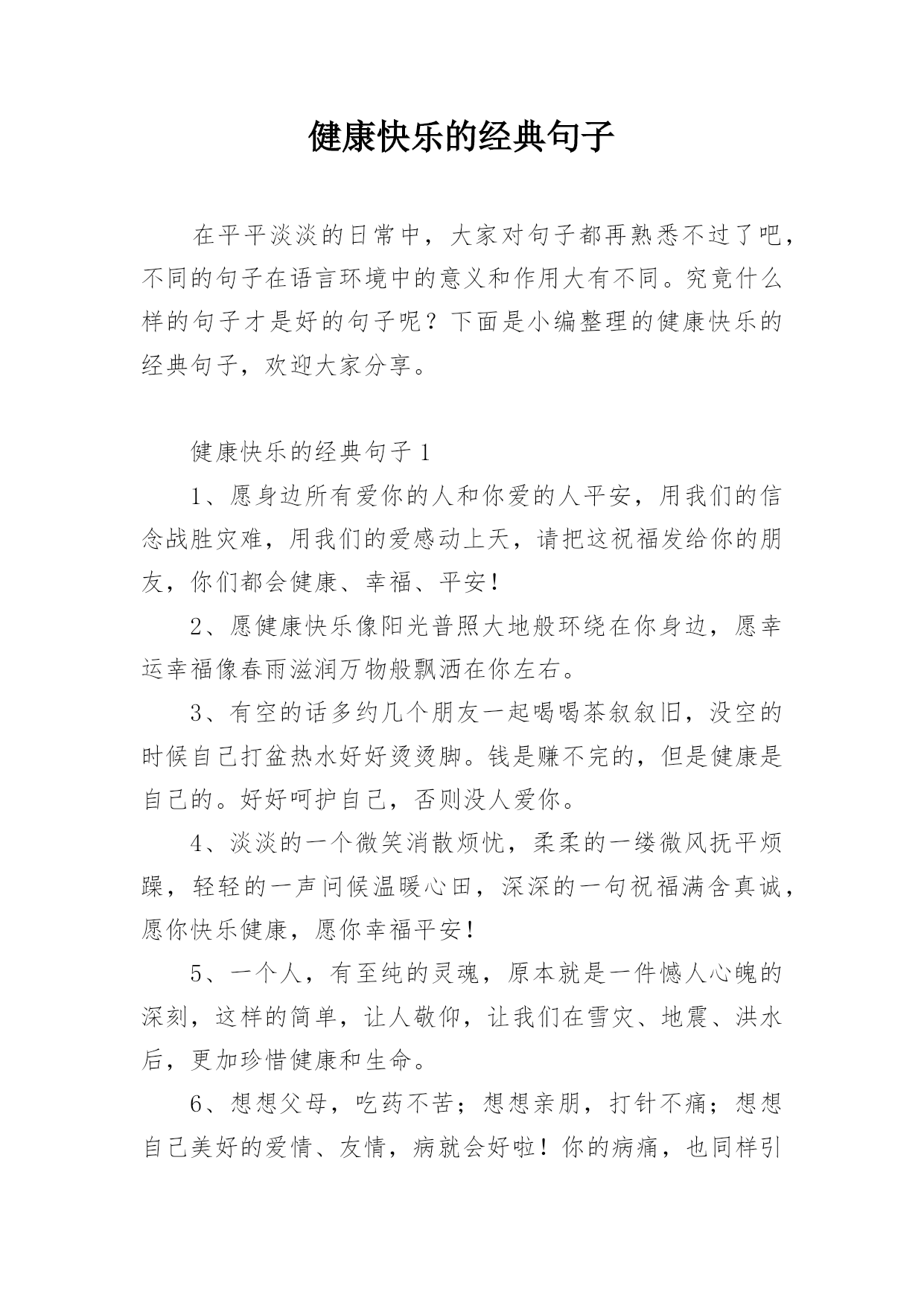 健康快乐的经典句子在平平淡淡的日常中,大家对句子都再熟悉不过了吧,不同的句子在语言环境中的意义和作用大有不同。究竟什么样的句子才是好的句子呢?下面是小编整理的健康快乐的经典句子,欢迎大家分享。健康快乐的经典句子11、愿身边所有爱你的人和你爱的人平安,用我们的信念战胜灾难,用我们的爱感动上天,请把这祝福发给你的朋友,你们都会健康、幸福、平安!2、愿健康快乐像阳光普照大地般环绕在你身边,愿幸运幸福像春雨滋润万物般飘洒在你左右。3、有空的话多约几个朋友一起喝喝茶叙叙旧,没空的时候自己打盆热水好好烫烫脚。钱是赚不