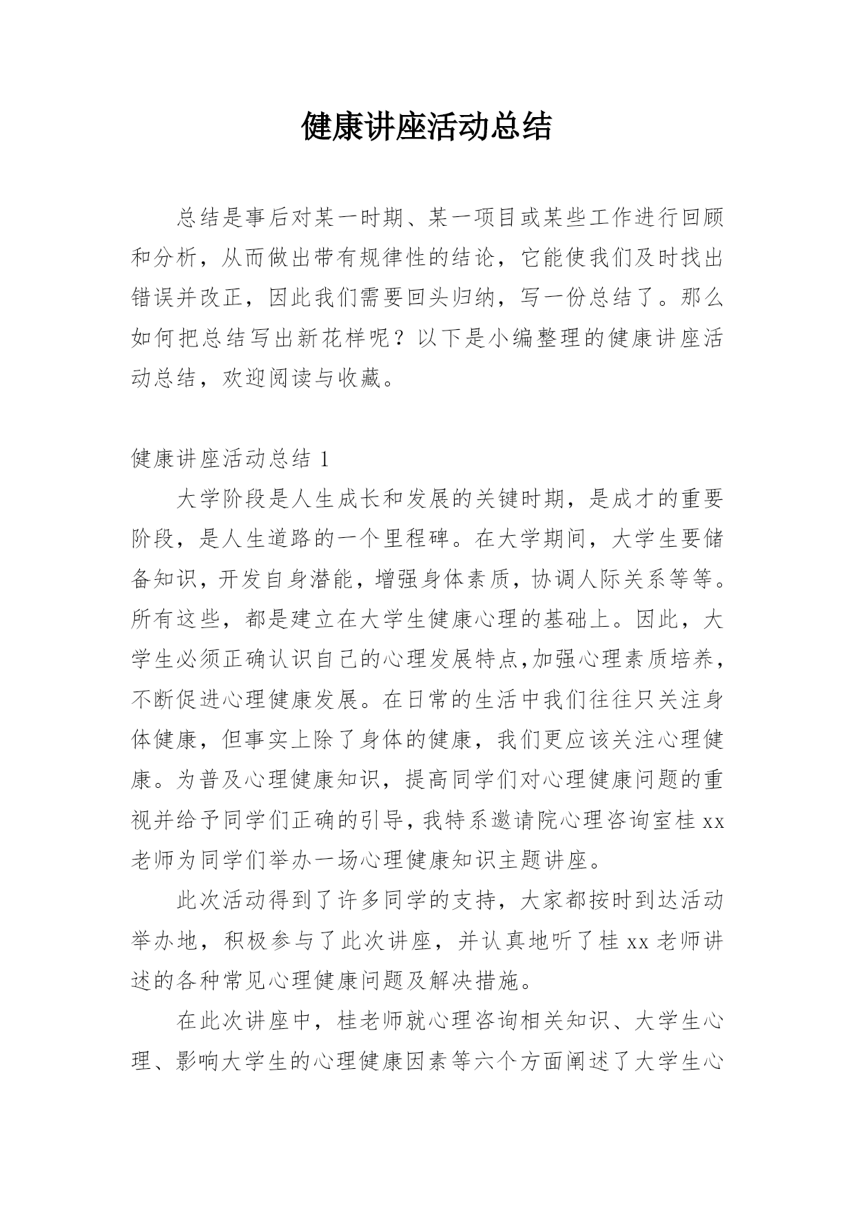 健康讲座活动总结总结是事后对某一时期、某一项目或某些工作进行回顾和分析,从而做出带有规律性的结论,它能使我们及时找出错误并改正,因此我们需要回头归纳,写一份总结了。那么如何把总结写出新花样呢?以下是小编整理的健康讲座活动总结,欢迎阅读与收藏。健康讲座活动总结1大学阶段是人生成长和发展的关键时期,是成才的重要阶段,是人生道路的一个里程碑。在大学期间,大学生要储备知识,开发自身潜能,增强身体素质,协调人际关系等等。所有这些,都是建立在大学生健康心理的基础上。因此,大学生必须正确认识自己的心理发展特点,加强心理