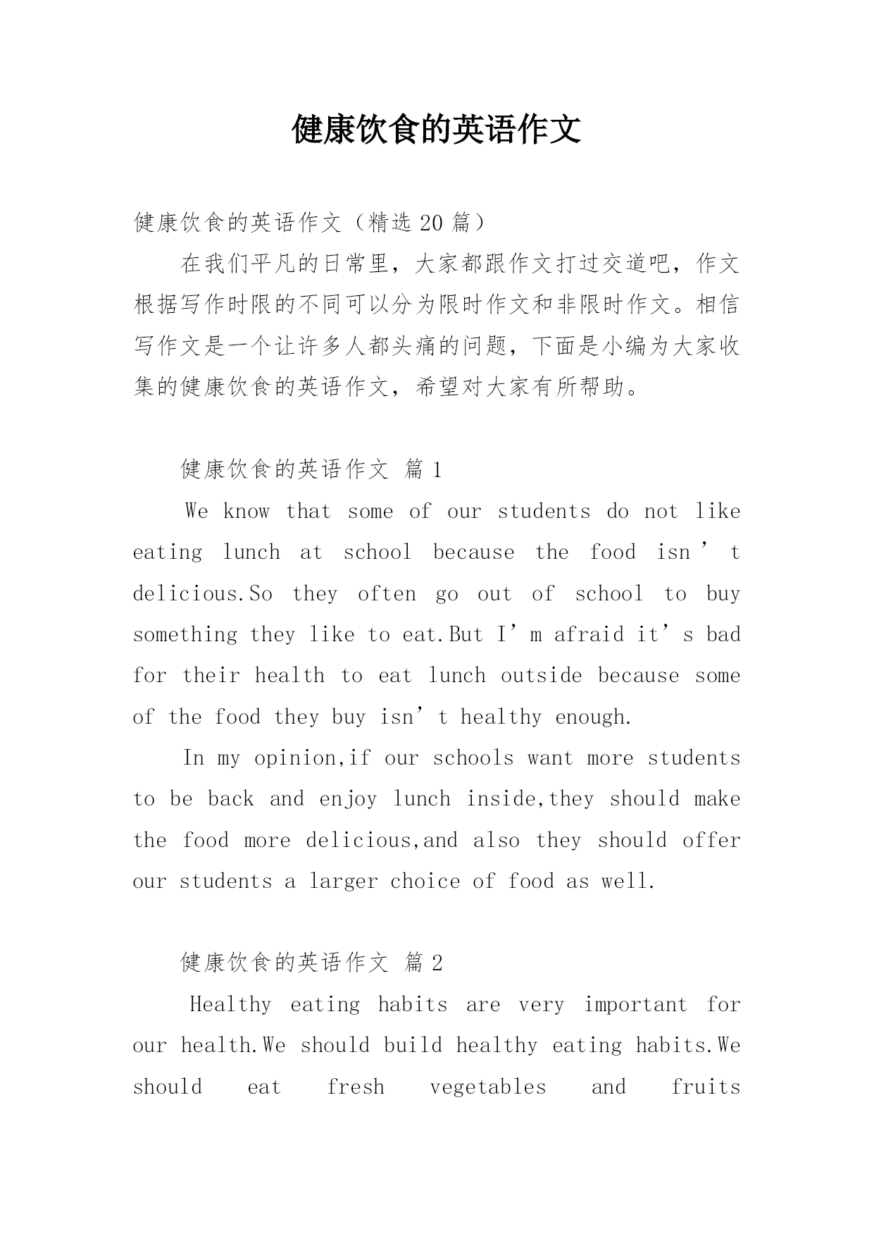 健康饮食的英语作文健康饮食的英语作文(精选20篇)在我们平凡的日常里,大家都跟作文打过交道吧,作文根据写作时限的不同可以分为限时作文和非限时作文。相信写作文是一个让许多人都头痛的问题,下面是小编为大家收集的健康饮食的英语作文,希望对大家有所帮助。健康饮食的英语作文篇1Weknowthatsomeofourstudentsdonotlikeeatinglunchatschoolbecausethefoodisn’tdelicious.Sotheyoftengooutofschooltobuysomethin