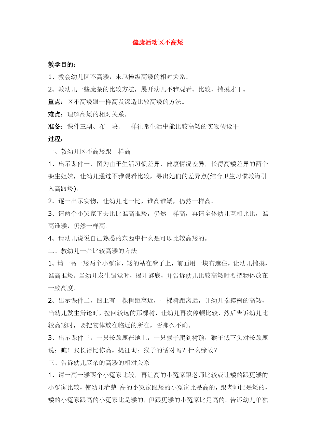 健康活动区不高矮教学目的:1、教会幼儿区不高矮,末尾操纵高矮的相对关系。2、教幼儿一些庞杂的比较方法,展开幼儿不雅观看、比较、揣摸才干。重点:区不高矮跟一样高及深造比较高矮的方法。难点:理解高矮的相对关系。准备:课件三副、布一块、一样往常生活中能比较高矮的实物假设干过程:一、教幼儿区不高矮跟一样高1、出示课件一,图为由于生活习惯差异,健康情况差异,长得高矮差异的两个娈生姐妹,让幼儿通过不雅观看比较,寻出她们的差异点(结合卫生习惯教诲引入高跟矮)。2、逐一出示实物,让幼儿比一比,谁高谁矮,仍然一样高。3、请