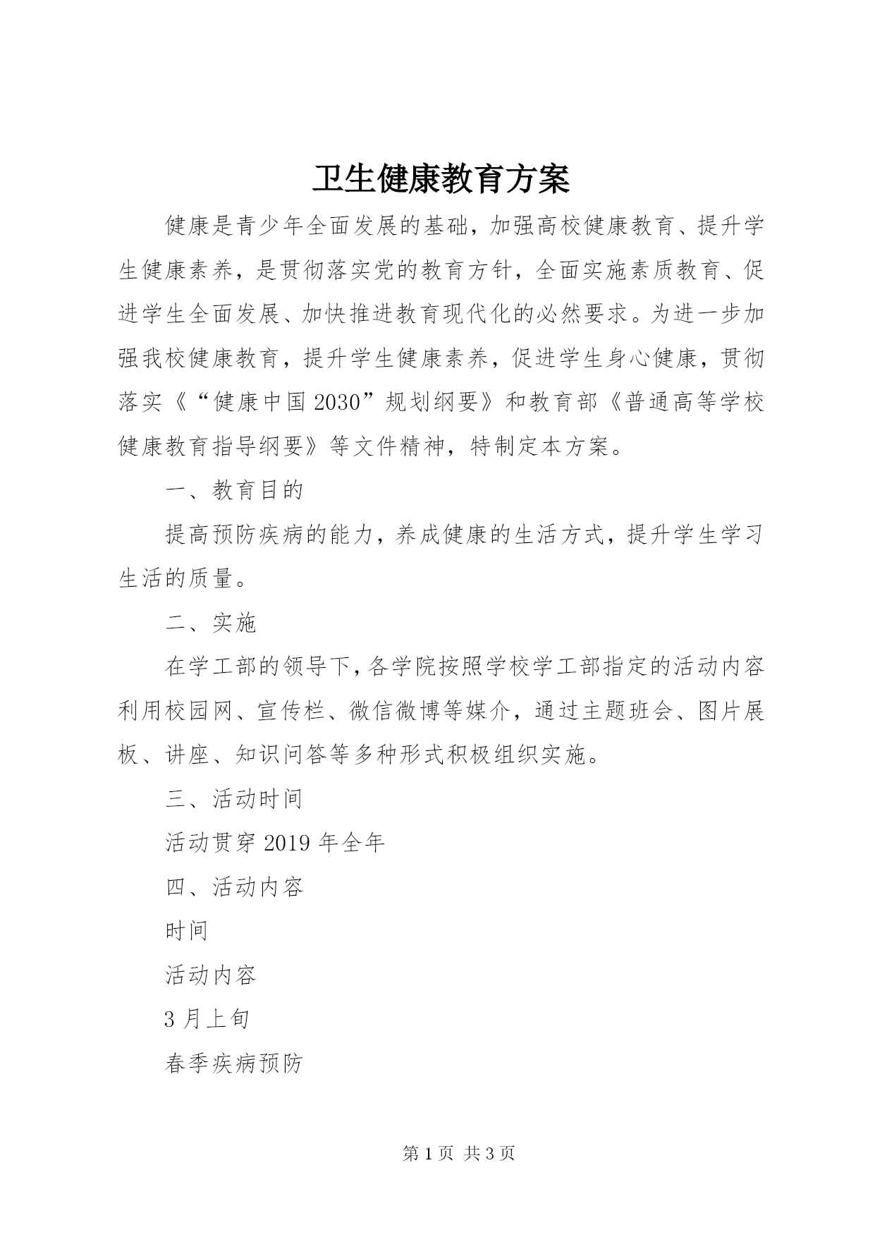 第PAGE\*Arabic\*MERGEFORMAT3页共NUMPAGES\*MERGEFORMAT3页卫生健康教育方案健康是青少年全面发展的基础,加强高校健康教育、提升学生健康素养,是贯彻落实党的教育方针,全面实施素质教育、促进学生全面发展、加快推进教育现代化的必然要求。为进一步加强我校健康教育,提升学生健康素养,促进学生身心健康,贯彻落实《“健康中国2030”规划纲要》和教育部《普通高等学校健康教育指导纲要》等文件精神,特制定本方案。一、教育目的提高预防疾病的能力,养成健康的生活方式,提升