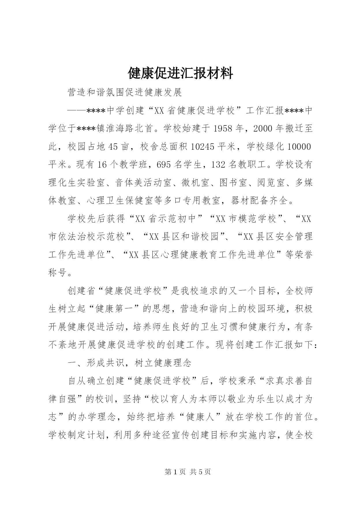 第PAGE\*Arabic\*MERGEFORMAT5页共NUMPAGES\*MERGEFORMAT5页健康促进汇报材料营造和谐氛围促进健康发展——****中学创建“XX省健康促进学校”工作汇报****中学位于****镇淮海路北首。学校始建于1958年,2000年搬迁至此,校园占地45亩,校舍总面积10245平米,学校绿化10000平米。现有16个教学班,695名学生,132名教职工。学校设有理化生实验室、音体美活动室、微机室、图书室、阅览室、多媒体教室、心理卫生保健室等多口专用教室,器材配备