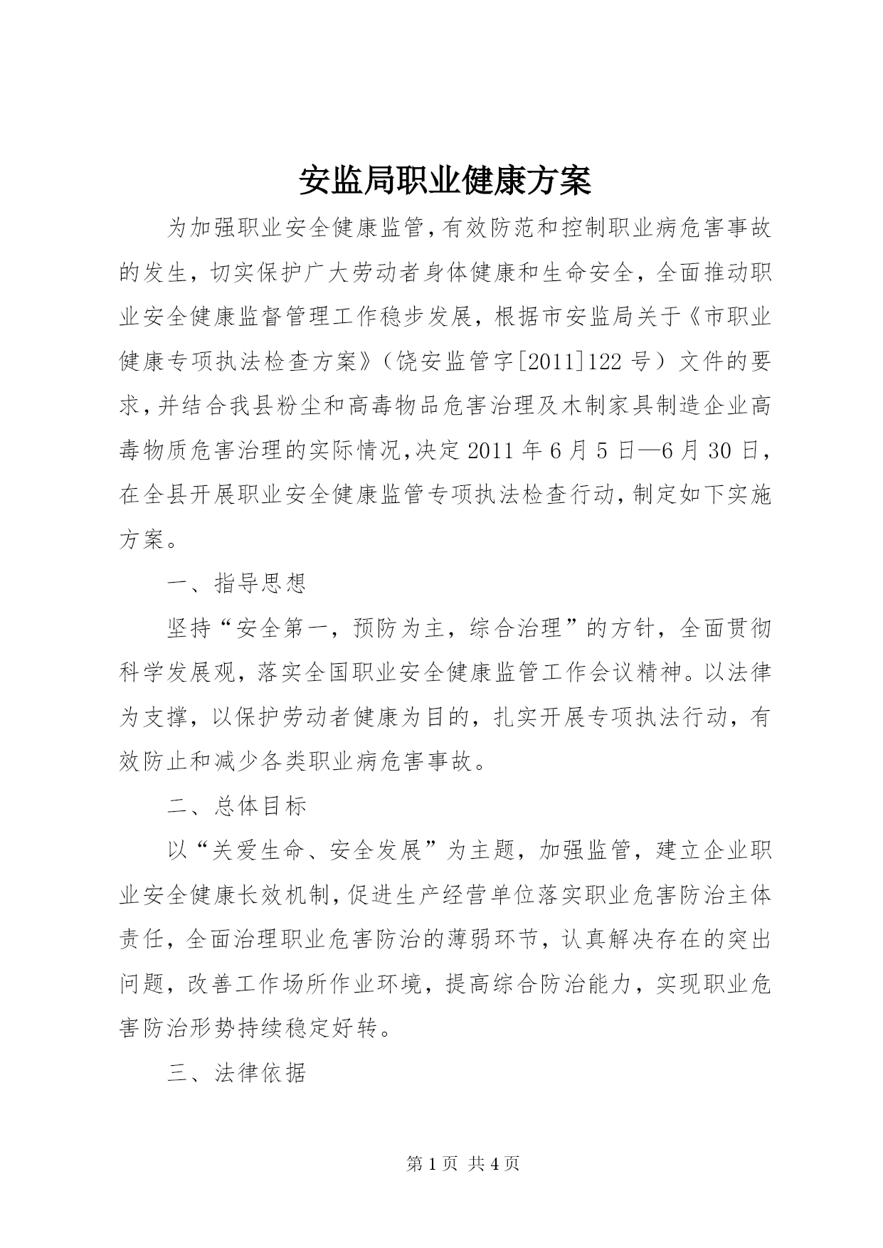 第PAGE\*Arabic\*MERGEFORMAT4页共NUMPAGES\*MERGEFORMAT4页安监局职业健康方案为加强职业安全健康监管,有效防范和控制职业病危害事故的发生,切实保护广大劳动者身体健康和生命安全,全面推动职业安全健康监督管理工作稳步发展,根据市安监局关于《市职业健康专项执法检查方案》(饶安监管字[2011]122号)文件的要求,并结合我县粉尘和高毒物品危害治理及木制家具制造企业高毒物质危害治理的实际情况,决定2011年6月5日—6月30日,在全县开展职业安全健康监管专项