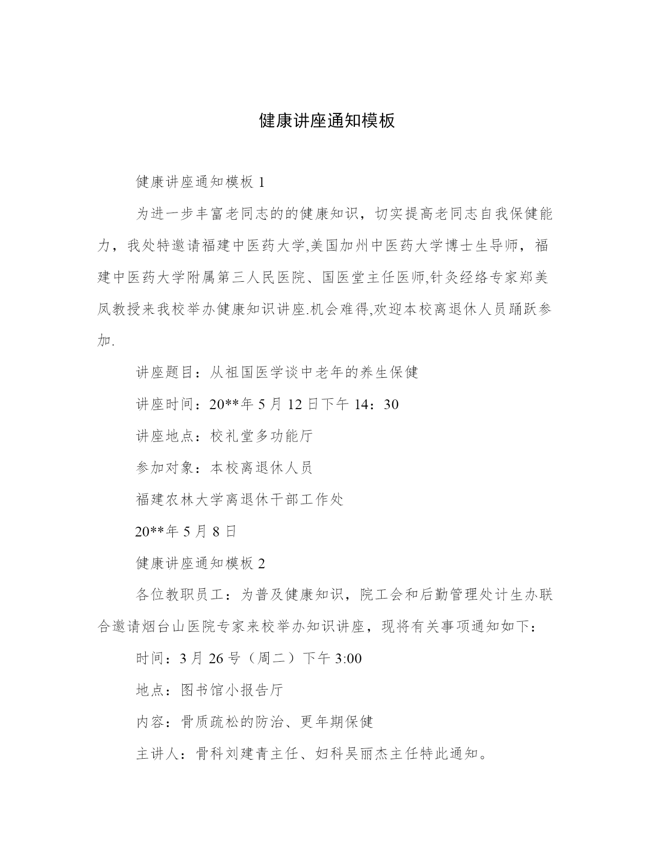 健康讲座通知模板健康讲座通知模板1为进一步丰富老同志的的健康知识,切实提高老同志自我保健能力,我处特邀请福建中医药大学,美国加州中医药大学博士生导师,福建中医药大学附属第三人民医院、国医堂主任医师,针灸经络专家郑美凤教授来我校举办健康知识讲座.机会难得,欢迎本校离退休人员踊跃参加.讲座题目:从祖国医学谈中老年的养生保健讲座时间:20**年5月12日下午14:30讲座地点:校礼堂多功能厅参加对象:本校离退休人员福建农林大学离退休干部工作处20**年5月8日健康讲座通知模板2各位教职员工:为普及健康知识,院工