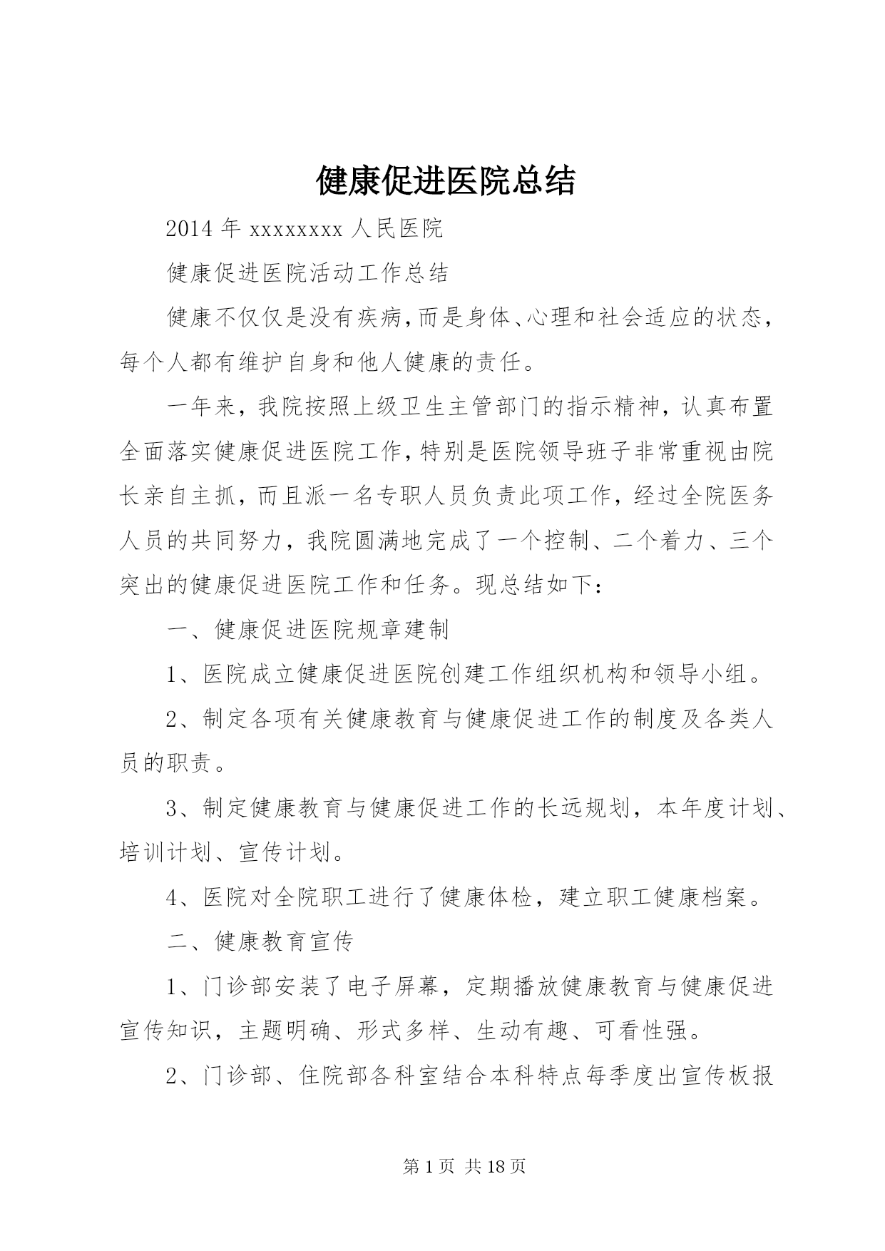 第PAGE\*Arabic\*MERGEFORMAT18页共NUMPAGES\*MERGEFORMAT18页健康促进医院总结2014年xxxxxxxx人民医院健康促进医院活动工作总结健康不仅仅是没有疾病,而是身体、心理和社会适应的状态,每个人都有维护自身和他人健康的责任。一年来,我院按照上级卫生主管部门的指示精神,认真布置全面落实健康促进医院工作,特别是医院领导班子非常重视由院长亲自主抓,而且派一名专职人员负责此项工作,经过全院医务人员的共同努力,我院圆满地完成了一个控制、二个着力、三个突出的