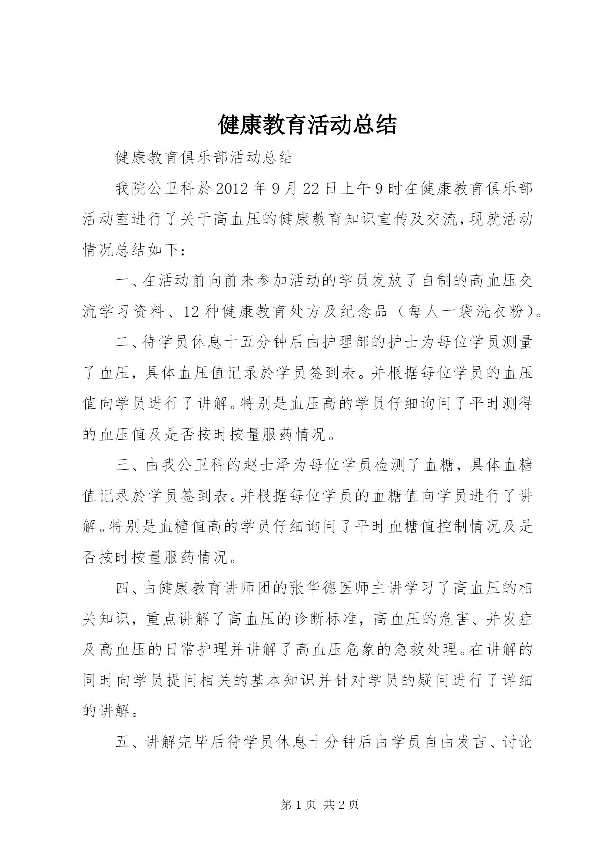 第PAGE\*Arabic\*MERGEFORMAT2页共NUMPAGES\*MERGEFORMAT2页健康教育活动总结健康教育俱乐部活动总结我院公卫科於2012年9月22日上午9时在健康教育俱乐部活动室进行了关于高血压的健康教育知识宣传及交流,现就活动情况总结如下:一、在活动前向前来参加活动的学员发放了自制的高血压交流学习资料、12种健康教育处方及纪念品(每人一袋洗衣粉)。二、待学员休息十五分钟后由护理部的护士为每位学员测量了血压,具体血压值记录於学员签到表。并根据每位学员的血压值向学员进行