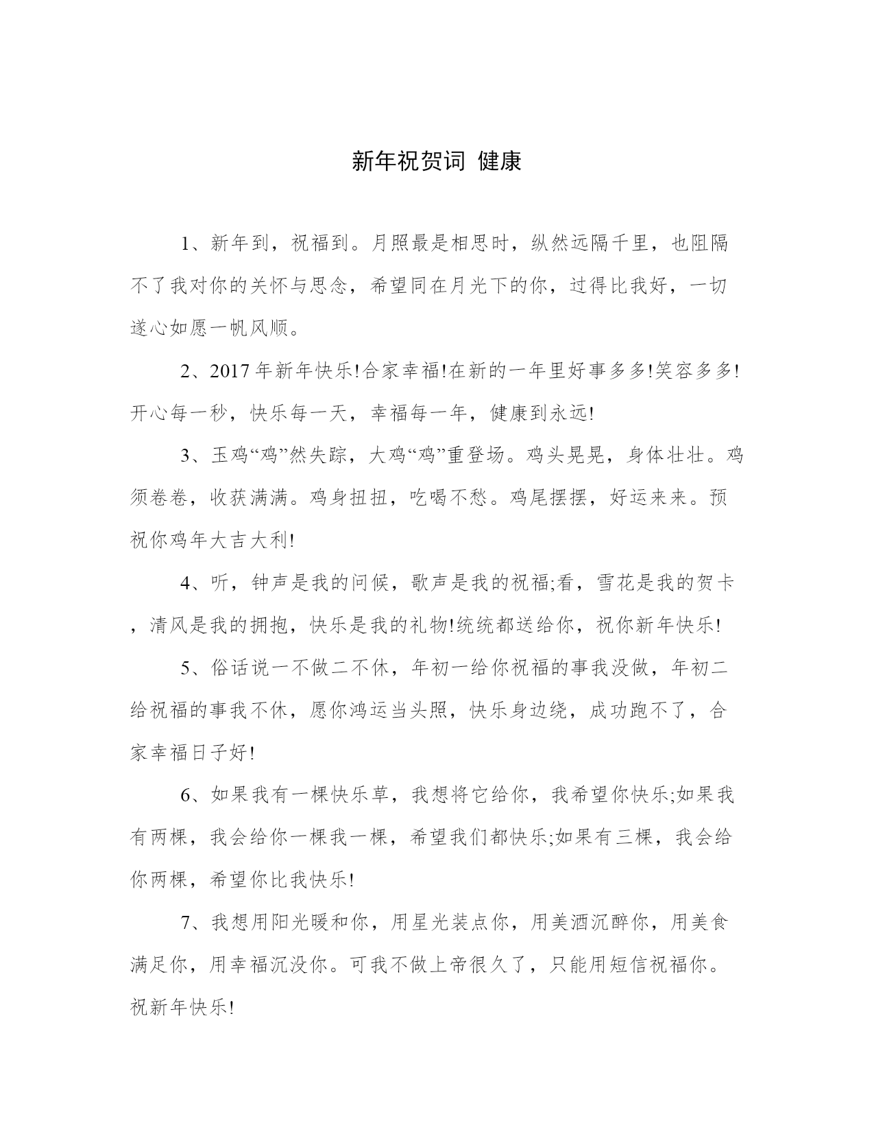新年祝贺词健康1、新年到,祝福到。月照最是相思时,纵然远隔千里,也阻隔不了我对你的关怀与思念,希望同在月光下的你,过得比我好,一切遂心如愿一帆风顺。2、2017年新年快乐!合家幸福!在新的一年里好事多多!笑容多多!开心每一秒,快乐每一天,幸福每一年,健康到永远!3、玉鸡“鸡”然失踪,大鸡“鸡”重登场。鸡头晃晃,身体壮壮。鸡须卷卷,收获满满。鸡身扭扭,吃喝不愁。鸡尾摆摆,好运来来。预祝你鸡年大吉大利!4、听,钟声是我的问候,歌声是我的祝福;看,雪花是我的贺卡,清风是我的拥抱,快乐是我的礼物!统统都送给你,祝