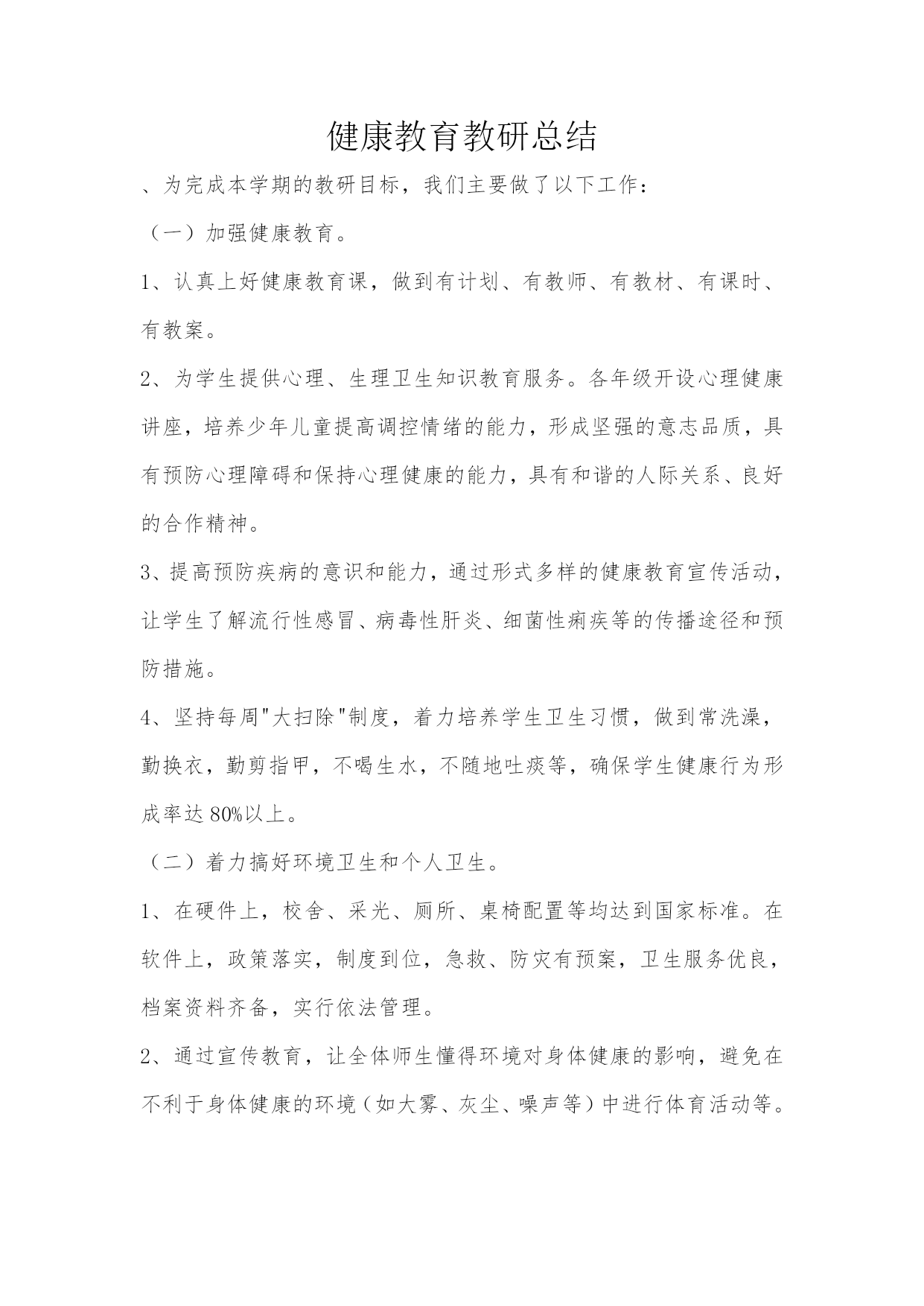 健康教育教研总结、为完成本学期的教研目标,我们主要做了以下工作:(一)加强健康教育。1、认真上好健康教育课,做到有计划、有教师、有教材、有课时、有教案。2、为学生提供心理、生理卫生知识教育服务。各年级开设心理健康讲座,培养少年儿童提高调控情绪的能力,形成坚强的意志品质,具有预防心理障碍和保持心理健康的能力,具有和谐的人际关系、良好的合作精神。3、提高预防疾病的意识和能力,通过形式多样的健康教育宣传活动,让学生了解流行性感冒、病毒性肝炎、细菌性痢疾等的传播途径和预防措施。4、坚持每周"大扫除"制度,着力培养