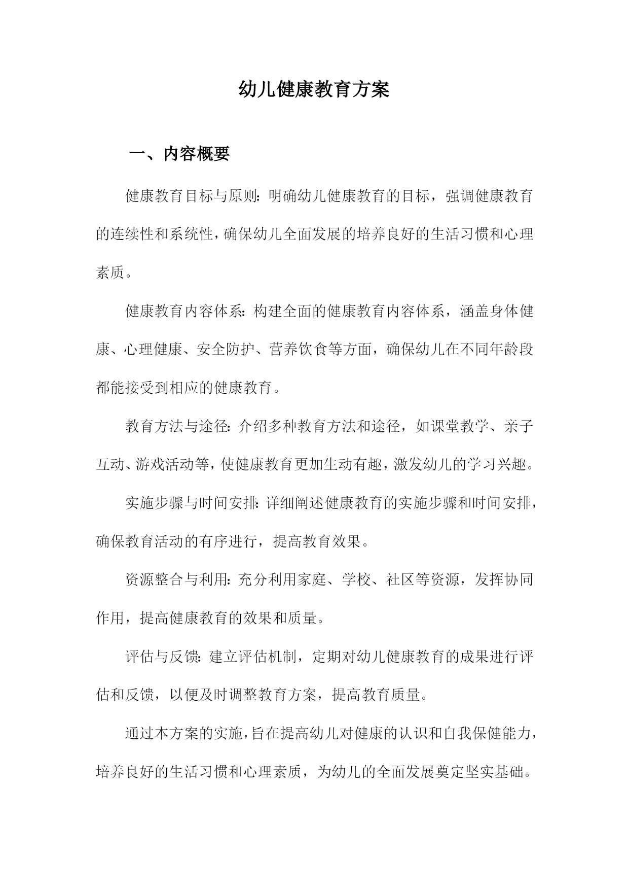 幼儿健康教育方案一、内容概要健康教育目标与原则:明确幼儿健康教育的目标,强调健康教育的连续性和系统性,确保幼儿全面发展的培养良好的生活习惯和心理素质。健康教育内容体系:构建全面的健康教育内容体系,涵盖身体健康、心理健康、安全防护、营养饮食等方面,确保幼儿在不同年龄段都能接受到相应的健康教育。教育方法与途径:介绍多种教育方法和途径,如课堂教学、亲子互动、游戏活动等,使健康教育更加生动有趣,激发幼儿的学习兴趣。实施步骤与时间安排:详细阐述健康教育的实施步骤和时间安排,确保教育活动的有序进行,提高教育效果。资源