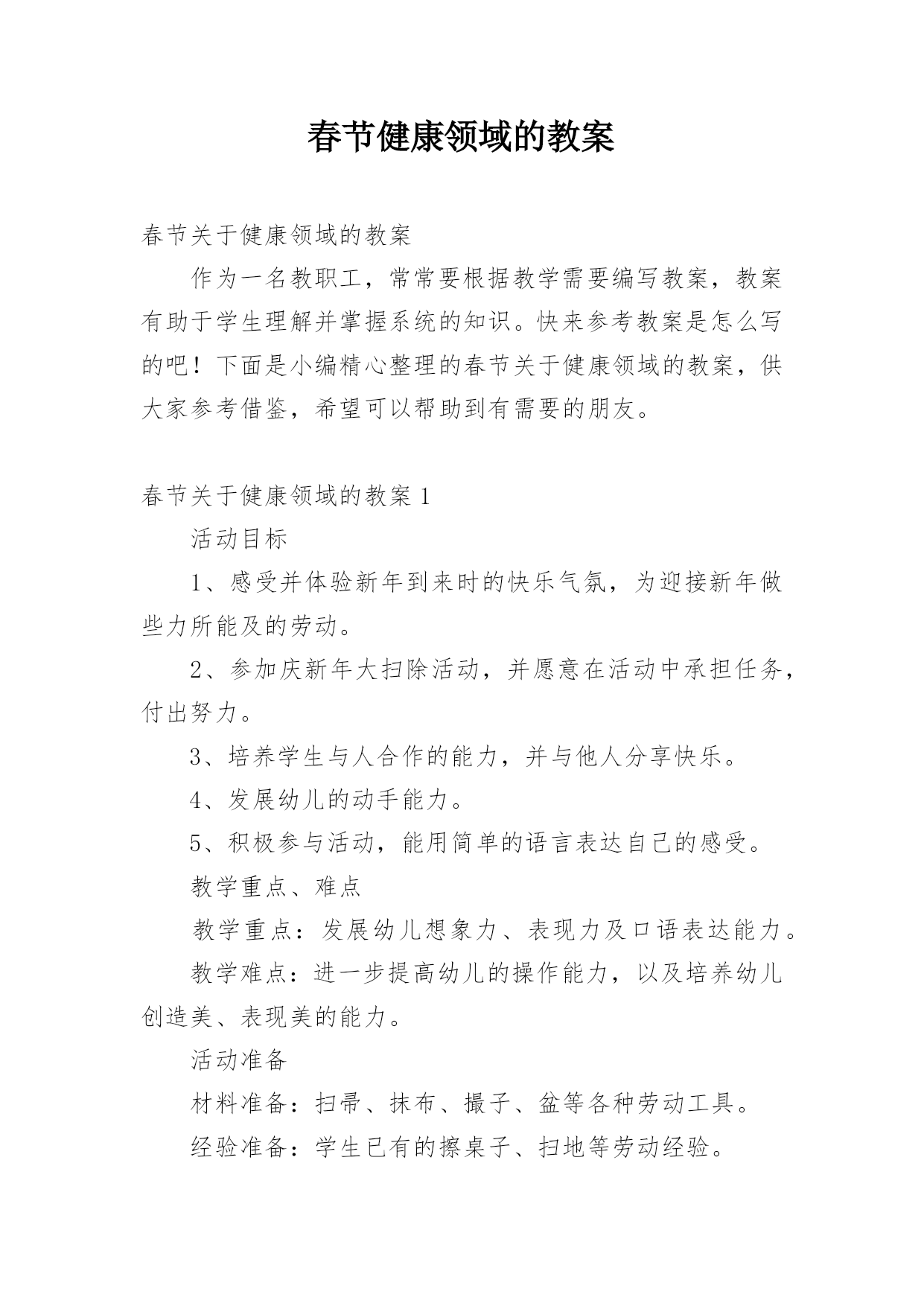 春节健康领域的教案春节关于健康领域的教案作为一名教职工,常常要根据教学需要编写教案,教案有助于学生理解并掌握系统的知识。快来参考教案是怎么写的吧!下面是小编精心整理的春节关于健康领域的教案,供大家参考借鉴,希望可以帮助到有需要的朋友。春节关于健康领域的教案1活动目标1、感受并体验新年到来时的快乐气氛,为迎接新年做些力所能及的劳动。2、参加庆新年大扫除活动,并愿意在活动中承担任务,付出努力。3、培养学生与人合作的能力,并与他人分享快乐。4、发展幼儿的动手能力。5、积极参与活动,能用简单的语言表达自己的感受。
