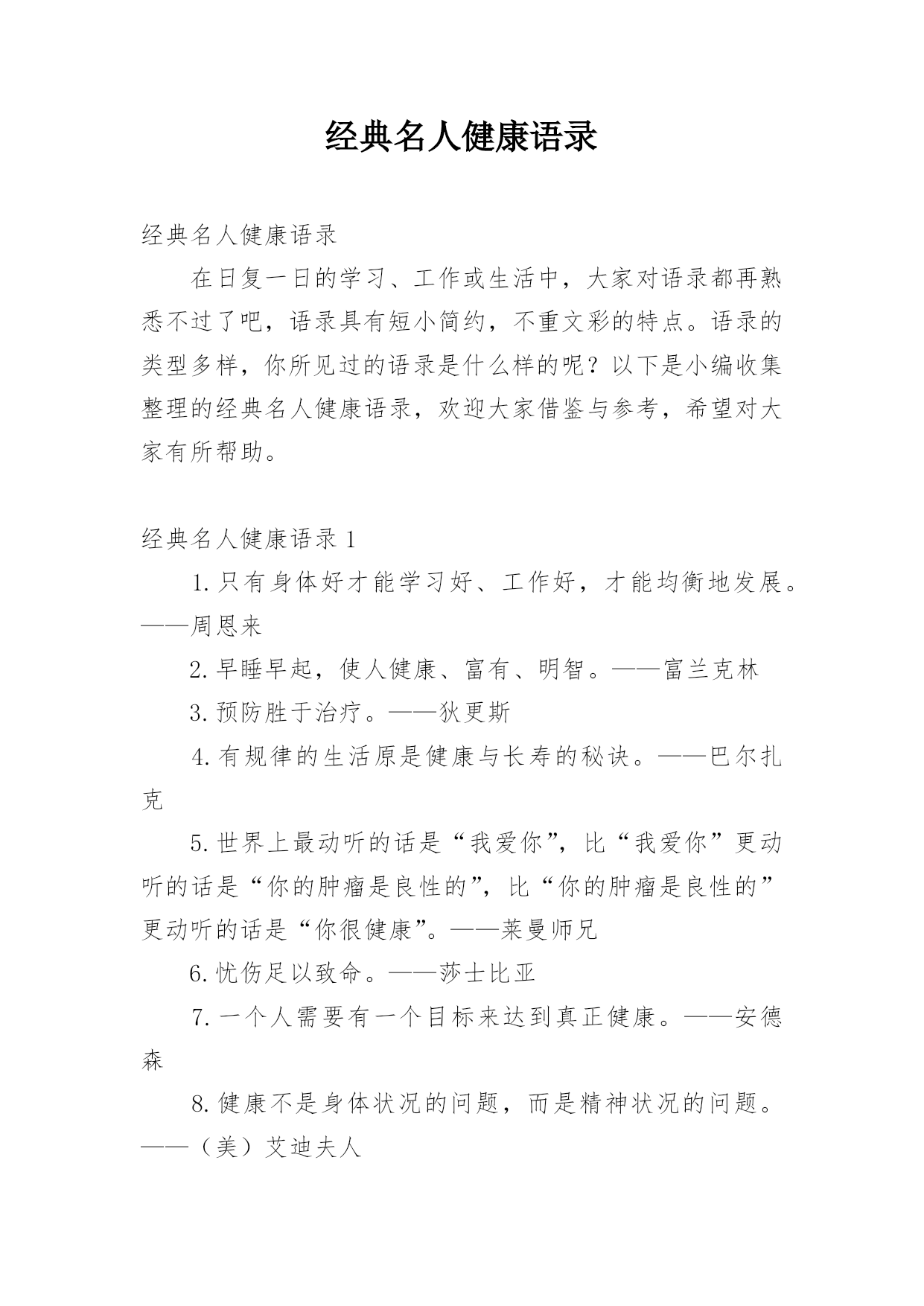 经典名人健康语录经典名人健康语录在日复一日的学习、工作或生活中,大家对语录都再熟悉不过了吧,语录具有短小简约,不重文彩的特点。语录的类型多样,你所见过的语录是什么样的呢?以下是小编收集整理的经典名人健康语录,欢迎大家借鉴与参考,希望对大家有所帮助。经典名人健康语录11.只有身体好才能学习好、工作好,才能均衡地发展。——周恩来2.早睡早起,使人健康、富有、明智。——富兰克林3.预防胜于治疗。——狄更斯4.有规律的生活原是健康与长寿的秘诀。——巴尔扎克5.世界上最动听的话是“我爱你”,比“我爱你”更动听的话是