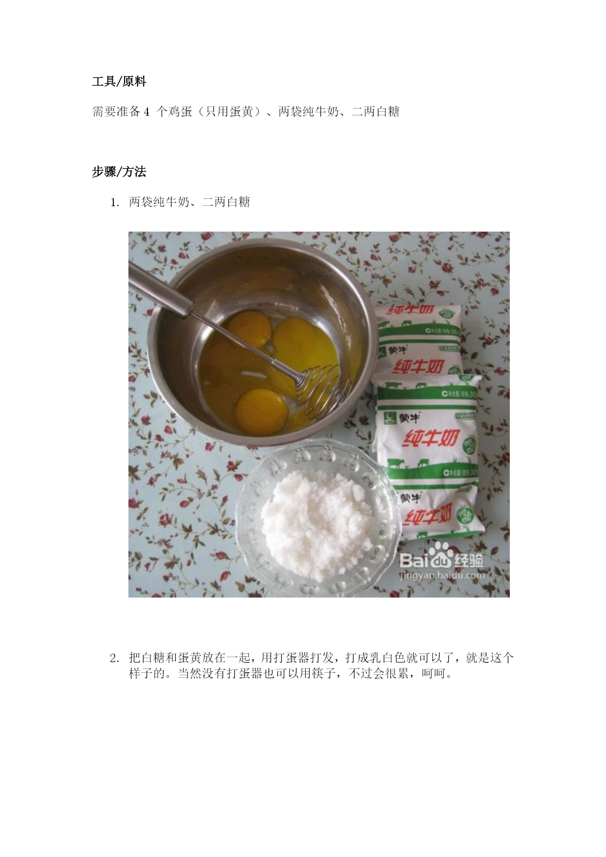 工具/原料需要准备4个鸡蛋(只用蛋黄)、两袋纯牛奶、二两白糖步骤/方法两袋纯牛奶、二两白糖把白糖和蛋黄放在一起,用打蛋器打发,打成乳白色就可以了,就是这个样子的。当然没有打蛋器也可以用筷子,不过会很累,呵呵。把牛奶倒入锅中,煮至微开将煮好的牛奶,用勺子慢慢舀入打好的蛋液中,边倒边搅拌。将搅拌好的蛋奶液再倒回锅中,煮至微沸,关火,倒入容器中晾凉把晾凉的的蛋奶液放进冰箱冷冻。最好是隔两个小时搅拌一下,这样就不会有冰碴了。如果家里有奶油,可以切1CM左右搅在蛋液里,这样味道会更香浓。怎么样,看着还不错吧,那就快