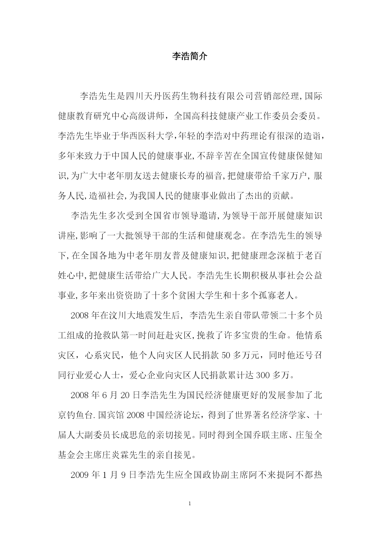 PAGEPAGE2李浩简介李浩先生是四川天丹医药生物科技有限公司营销部经理,国际健康教育研究中心高级讲师,全国高科技健康产业工作委员会委员。李浩先生毕业于华西医科大学,年轻的李浩对中药理论有很深的造诣,多年来致力于中国人民的健康事业,不辞辛苦在全国宣传健康保健知识,为广大中老年朋友送去健康长寿的福音,把健康带给千家万户,服务人民,造福社会,为我国人民的健康事业做出了杰出的贡献。李浩先生多次受到全国省市领导邀请,为领导干部开展健康知识讲座,影响了一大批领导干部的生活和健康观念。在李浩先生的领导下