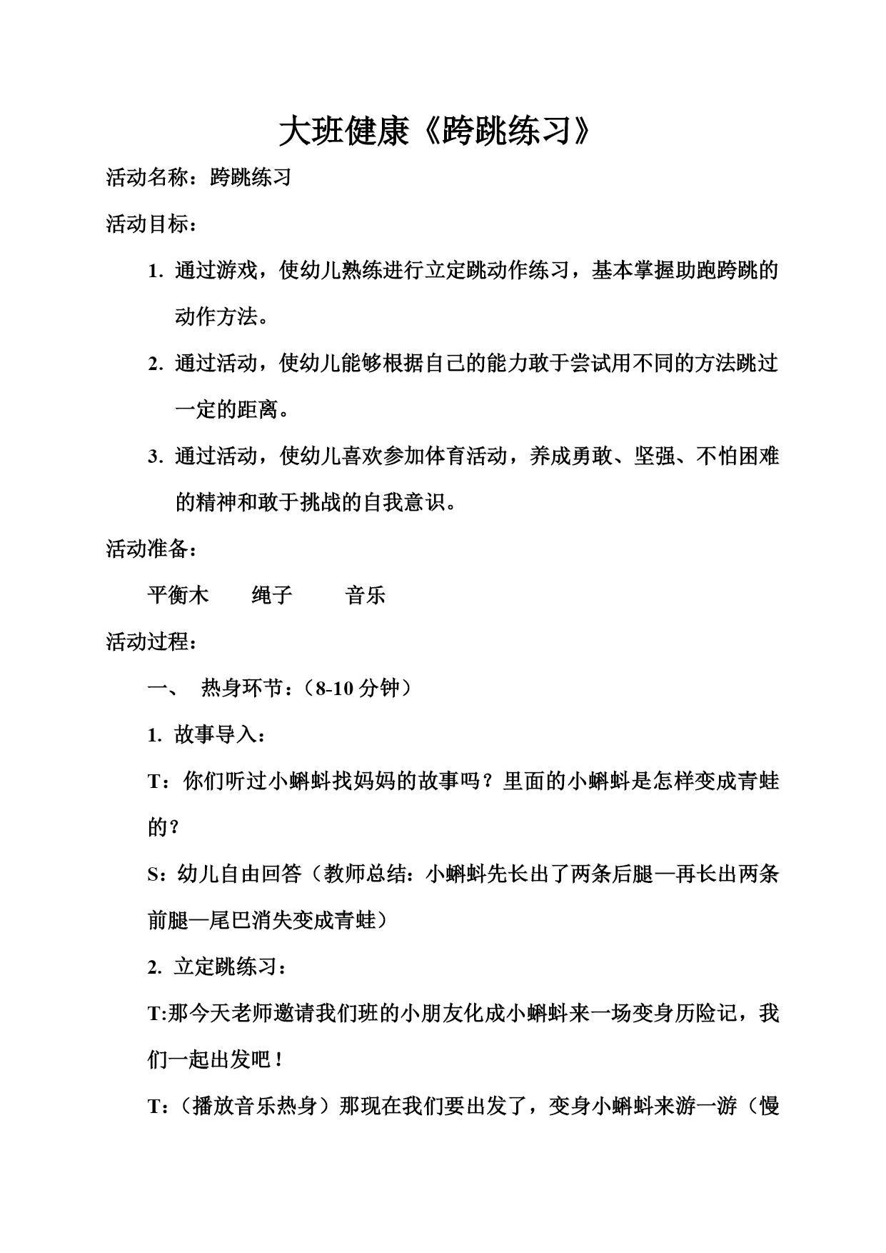 大班健康《跨跳练习》活动名称:跨跳练习活动目标:通过游戏,使幼儿熟练进行立定跳动作练习,基本掌握助跑跨跳的动作方法。通过活动,使幼儿能够根据自己的能力敢于尝试用不同的方法跳过一定的距离。通过活动,使幼儿喜欢参加体育活动,养成勇敢、坚强、不怕困难的精神和敢于挑战的自我意识。活动准备:平衡木绳子音乐活动过程:热身环节:(8-10分钟)故事导入:T:你们听过小蝌蚪找妈妈的故事吗?里面的小蝌蚪是怎样变成青蛙的?S:幼儿自由回答(教师总结:小蝌蚪先长出了两条后腿—再长出两条前腿—尾巴消失变成青蛙)立定跳练习:T:那