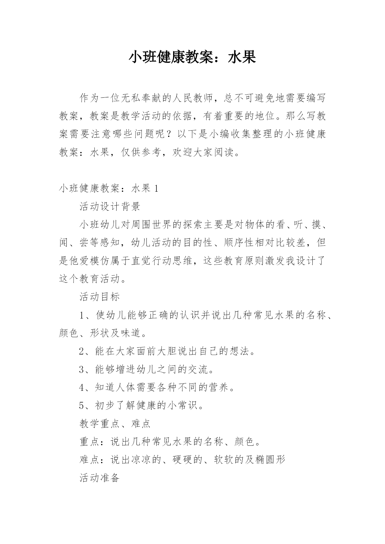 小班健康教案:水果作为一位无私奉献的人民教师,总不可避免地需要编写教案,教案是教学活动的依据,有着重要的地位。那么写教案需要注意哪些问题呢?以下是小编收集整理的小班健康教案:水果,仅供参考,欢迎大家阅读。小班健康教案:水果1活动设计背景小班幼儿对周围世界的探索主要是对物体的看、听、摸、闻、尝等感知,幼儿活动的目的性、顺序性相对比较差,但是他爱模仿属于直觉行动思维,这些教育原则激发我设计了这个教育活动。活动目标1、使幼儿能够正确的认识并说出几种常见水果的名称、颜色、形状及味道。2、能在大家面前大胆说出自己的