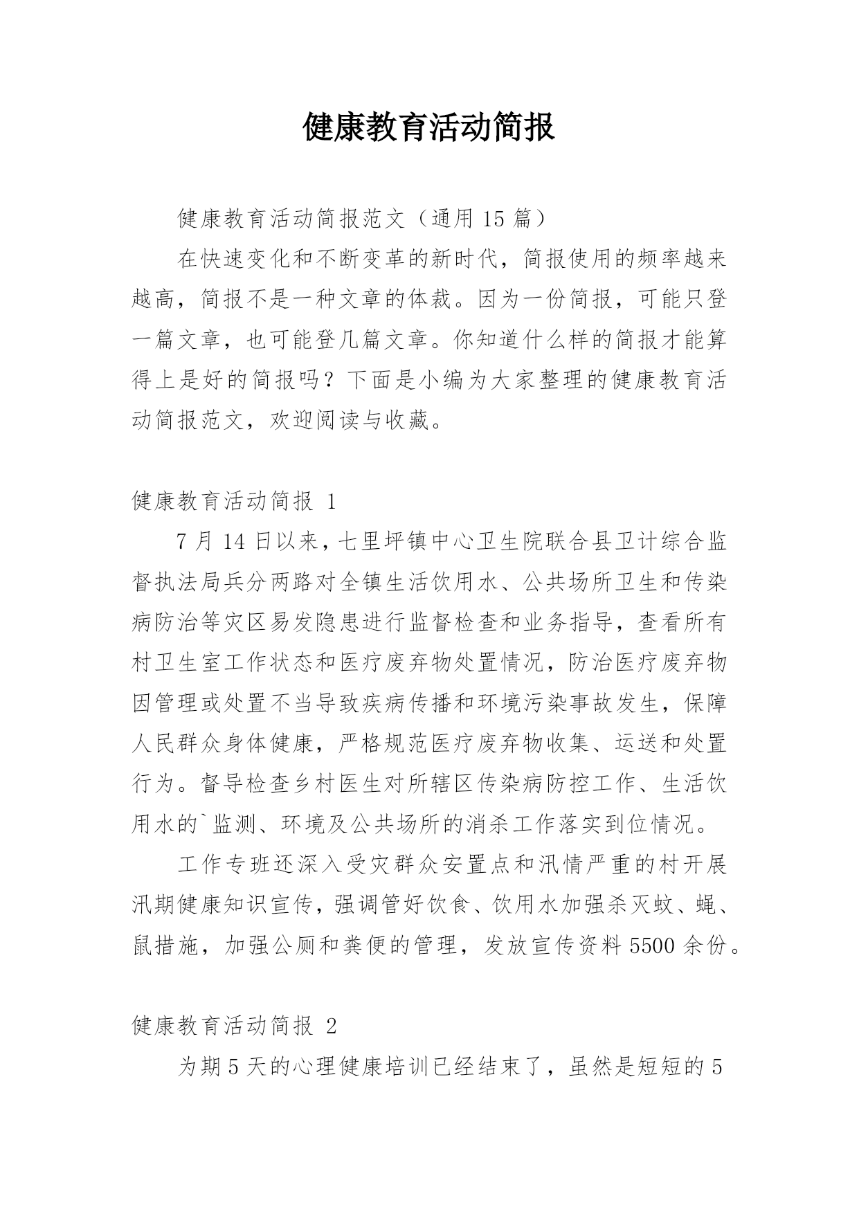健康教育活动简报健康教育活动简报范文(通用15篇)在快速变化和不断变革的新时代,简报使用的频率越来越高,简报不是一种文章的体裁。因为一份简报,可能只登一篇文章,也可能登几篇文章。你知道什么样的简报才能算得上是好的简报吗?下面是小编为大家整理的健康教育活动简报范文,欢迎阅读与收藏。健康教育活动简报17月14日以来,七里坪镇中心卫生院联合县卫计综合监督执法局兵分两路对全镇生活饮用水、公共场所卫生和传染病防治等灾区易发隐患进行监督检查和业务指导,查看所有村卫生室工作状态和医疗废弃物处置情况,防治医疗废弃物因管理