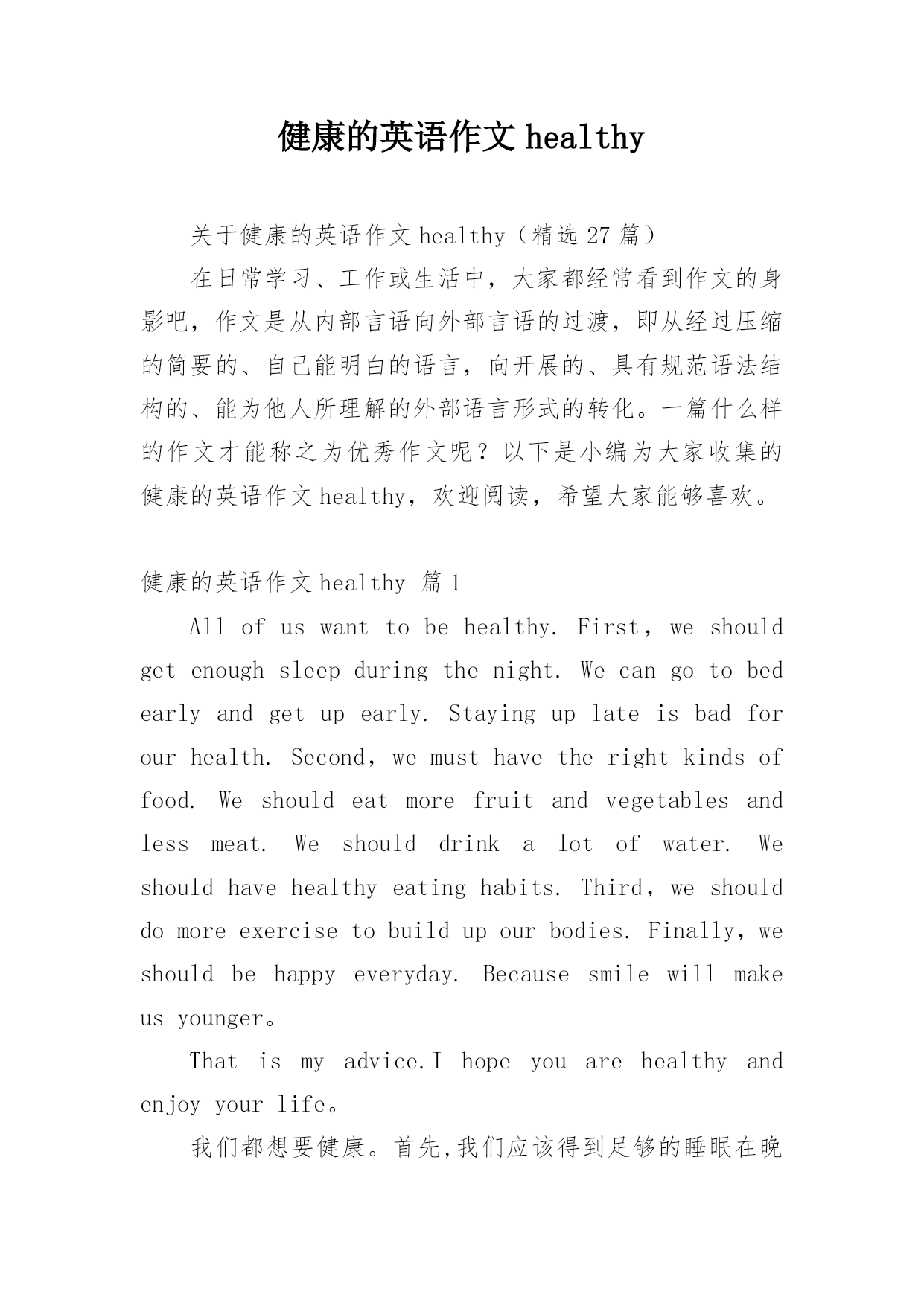 健康的英语作文healthy关于健康的英语作文healthy(精选27篇)在日常学习、工作或生活中,大家都经常看到作文的身影吧,作文是从内部言语向外部言语的过渡,即从经过压缩的简要的、自己能明白的语言,向开展的、具有规范语法结构的、能为他人所理解的外部语言形式的转化。一篇什么样的作文才能称之为优秀作文呢?以下是小编为大家收集的健康的英语作文healthy,欢迎阅读,希望大家能够喜欢。健康的英语作文healthy篇1Allofuswanttobehealthy.First,weshouldgetenough