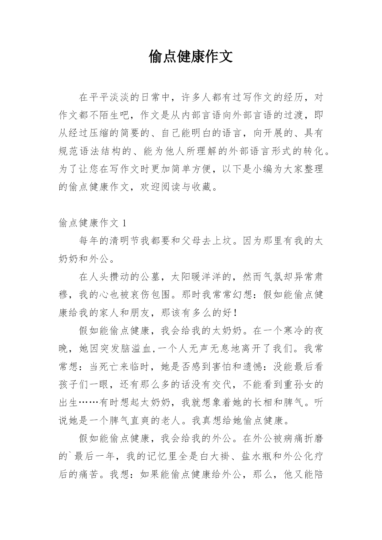 偷点健康作文在平平淡淡的日常中,许多人都有过写作文的经历,对作文都不陌生吧,作文是从内部言语向外部言语的过渡,即从经过压缩的简要的、自己能明白的语言,向开展的、具有规范语法结构的、能为他人所理解的外部语言形式的转化。为了让您在写作文时更加简单方便,以下是小编为大家整理的偷点健康作文,欢迎阅读与收藏。偷点健康作文1每年的清明节我都要和父母去上坟。因为那里有我的太奶奶和外公。在人头攒动的公墓,太阳暖洋洋的,然而气氛却异常肃穆,我的心也被哀伤包围。那时我常常幻想:假如能偷点健康给我的家人和朋友,那该有多么的好!
