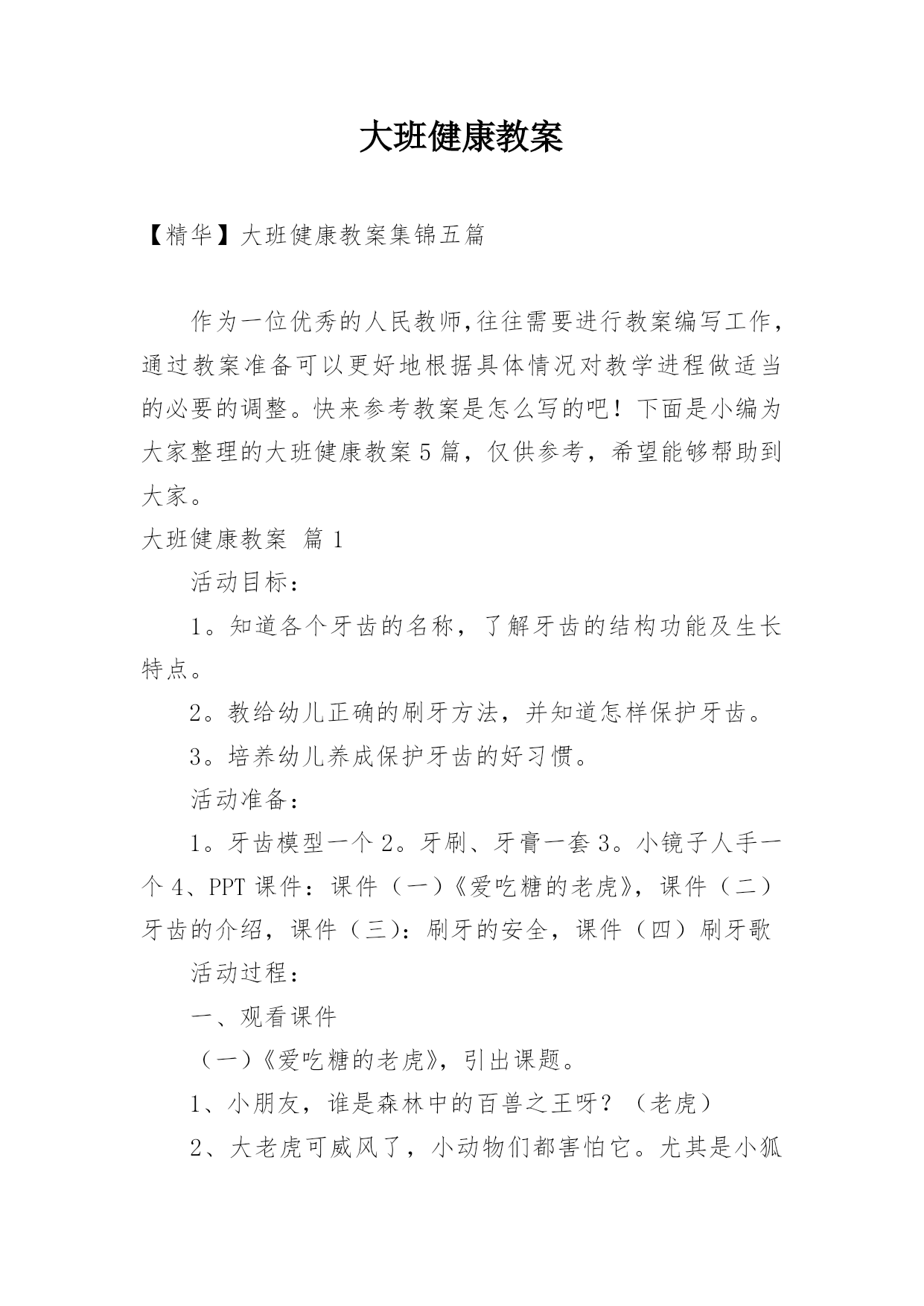大班健康教案【精华】大班健康教案集锦五篇作为一位优秀的人民教师,往往需要进行教案编写工作,通过教案准备可以更好地根据具体情况对教学进程做适当的必要的调整。快来参考教案是怎么写的吧!下面是小编为大家整理的大班健康教案5篇,仅供参考,希望能够帮助到大家。大班健康教案篇1活动目标:1。知道各个牙齿的名称,了解牙齿的结构功能及生长特点。2。教给幼儿正确的刷牙方法,并知道怎样保护牙齿。3。培养幼儿养成保护牙齿的好习惯。活动准备:1。牙齿模型一个2。牙刷、牙膏一套3。小镜子人手一个4、PPT课件:课件(一)《爱吃糖的