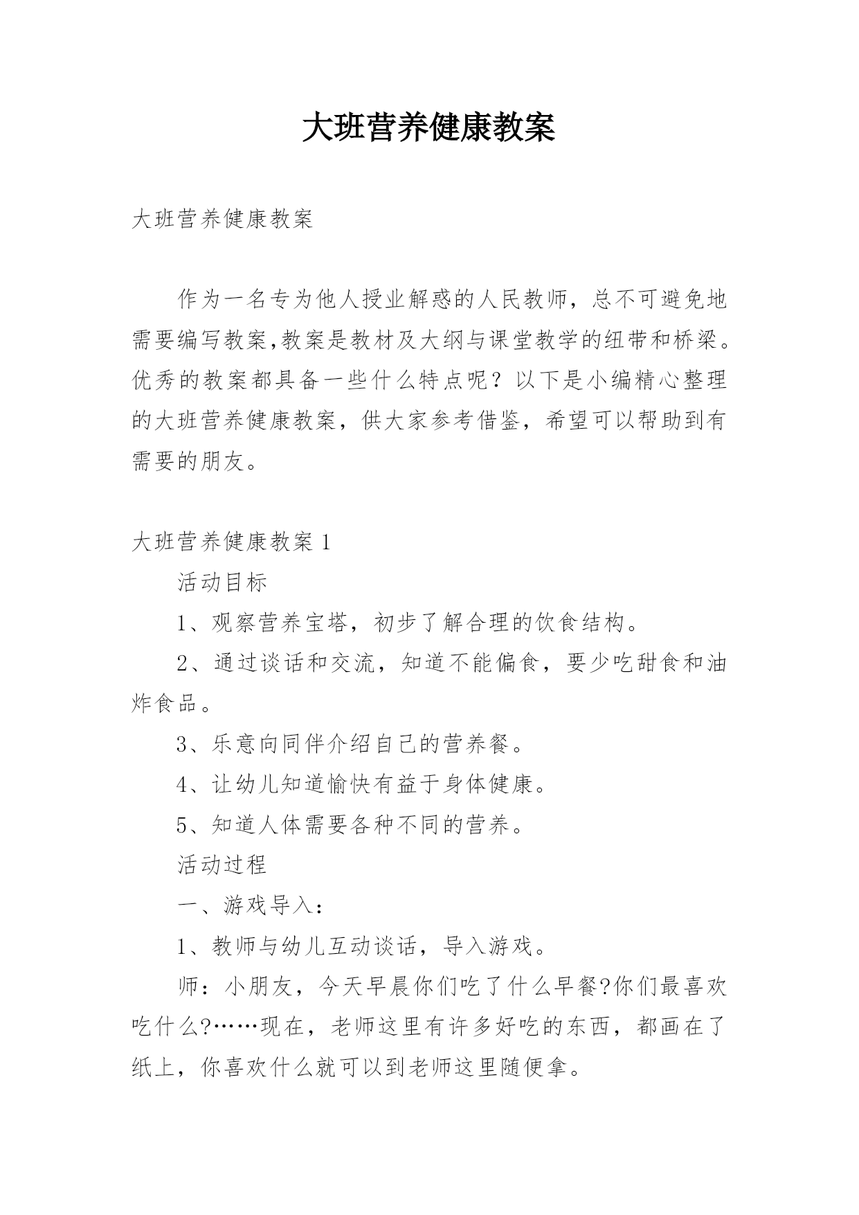 大班营养健康教案大班营养健康教案作为一名专为他人授业解惑的人民教师,总不可避免地需要编写教案,教案是教材及大纲与课堂教学的纽带和桥梁。优秀的教案都具备一些什么特点呢?以下是小编精心整理的大班营养健康教案,供大家参考借鉴,希望可以帮助到有需要的朋友。大班营养健康教案1活动目标1、观察营养宝塔,初步了解合理的饮食结构。2、通过谈话和交流,知道不能偏食,要少吃甜食和油炸食品。3、乐意向同伴介绍自己的营养餐。4、让幼儿知道愉快有益于身体健康。5、知道人体需要各种不同的营养。活动过程一、游戏导入:1、教师与幼儿互动