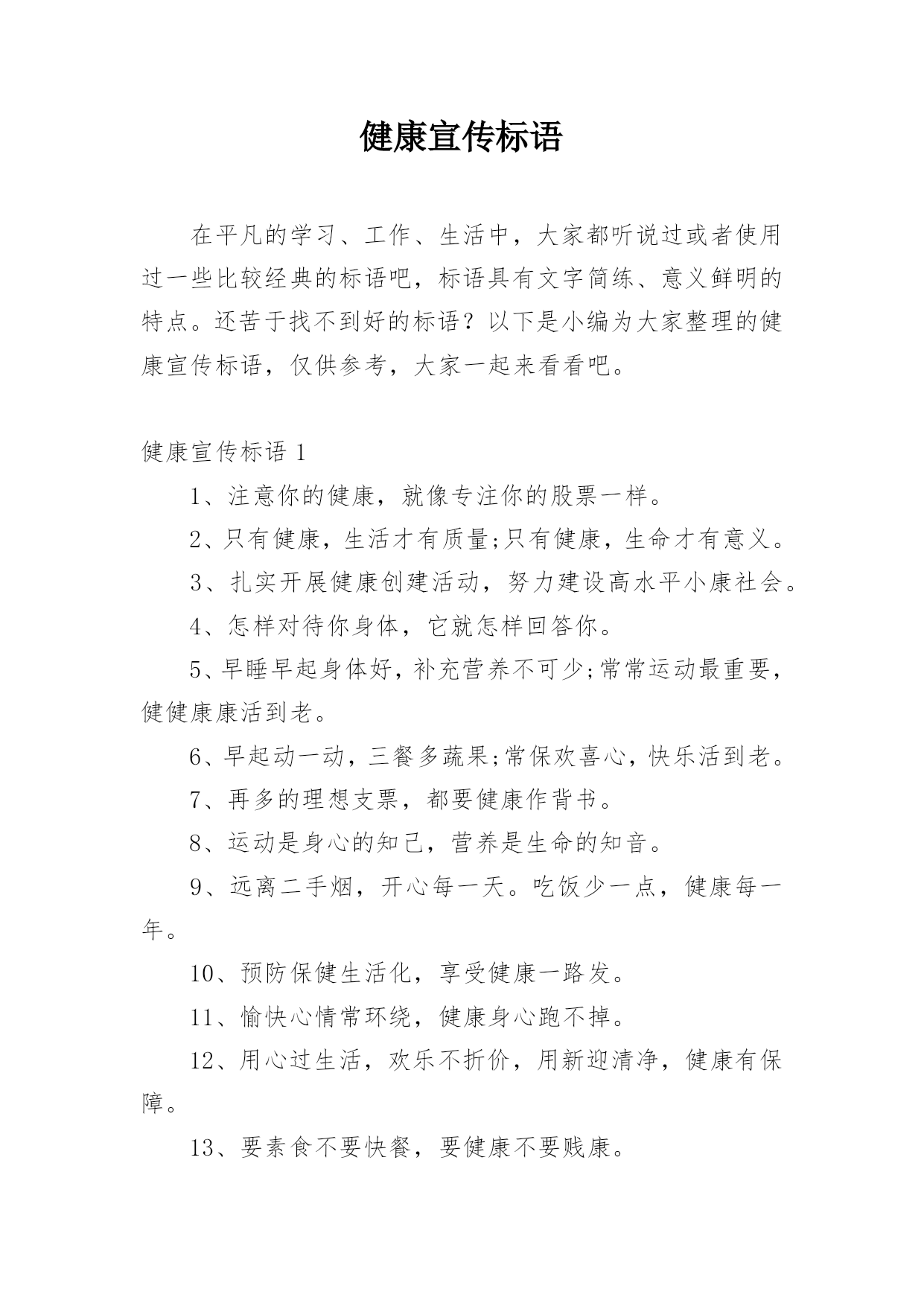 健康宣传标语在平凡的学习、工作、生活中,大家都听说过或者使用过一些比较经典的标语吧,标语具有文字简练、意义鲜明的特点。还苦于找不到好的标语?以下是小编为大家整理的健康宣传标语,仅供参考,大家一起来看看吧。健康宣传标语11、注意你的健康,就像专注你的股票一样。2、只有健康,生活才有质量;只有健康,生命才有意义。3、扎实开展健康创建活动,努力建设高水平小康社会。4、怎样对待你身体,它就怎样回答你。5、早睡早起身体好,补充营养不可少;常常运动最重要,健健康康活到老。6、早起动一动,三餐多蔬果;常保欢喜心,快乐活