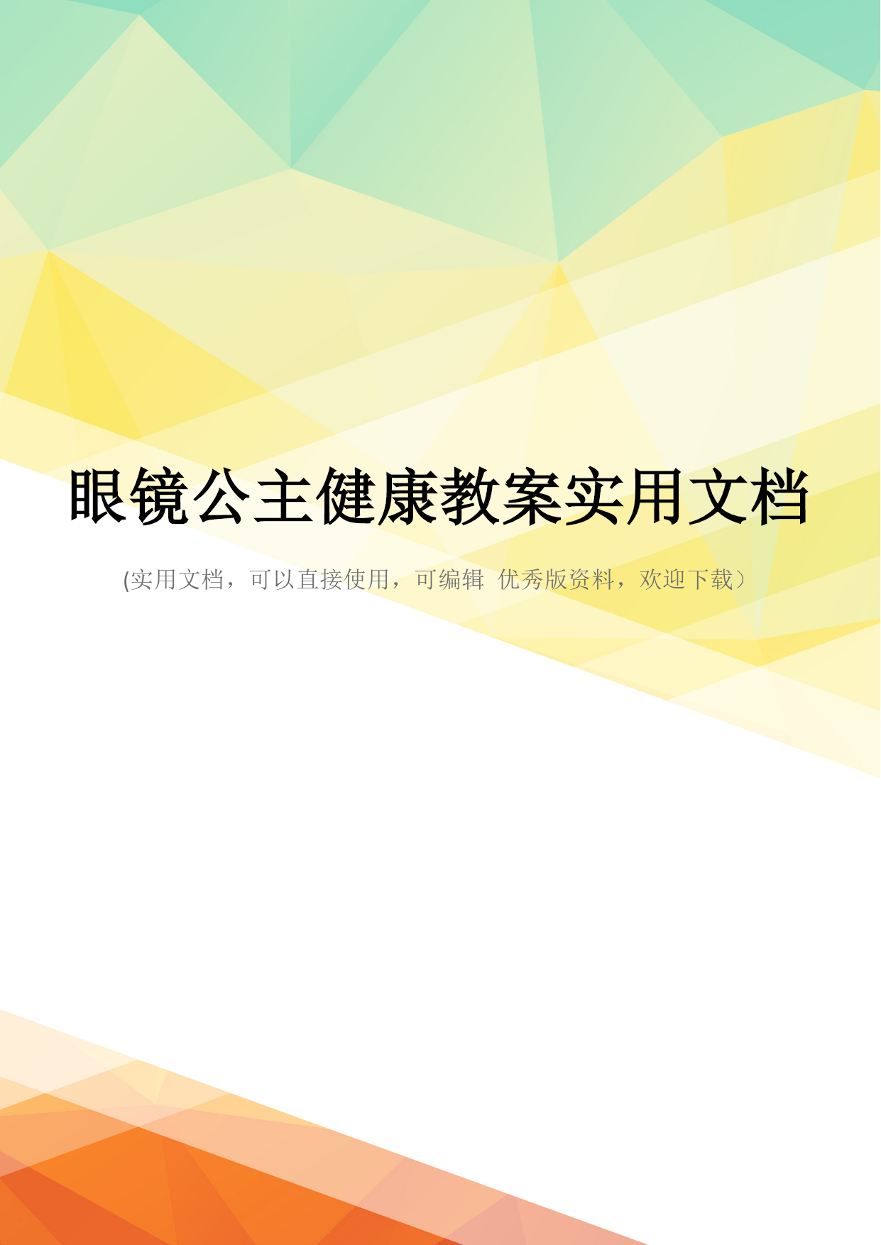 眼镜公主健康教案实用文档(实用文档,可以直接使用,可编辑优秀版资料,欢迎下载)《眼镜公主》一、教学目标:1、了解近视给人们生活带来的不便,体会眼睛在学习、生活中的重要作用。2、学习保护眼睛的正确方法,养成爱护眼睛的良好习惯。二、教学准备:1、经验准备:初步了解眼睛的作用。2、物质准备:《眼镜公主》ppt、眼球操、绘本故事三、教学过程:1、故事导入,了解近视给人们生活带来的不便.(1)看不清的烦恼师:今天我请来了一位公主,她在做一些什么奇怪的事情?教师播放课件,幼儿观察。师小结:原来公主得了近视眼。(2)戴