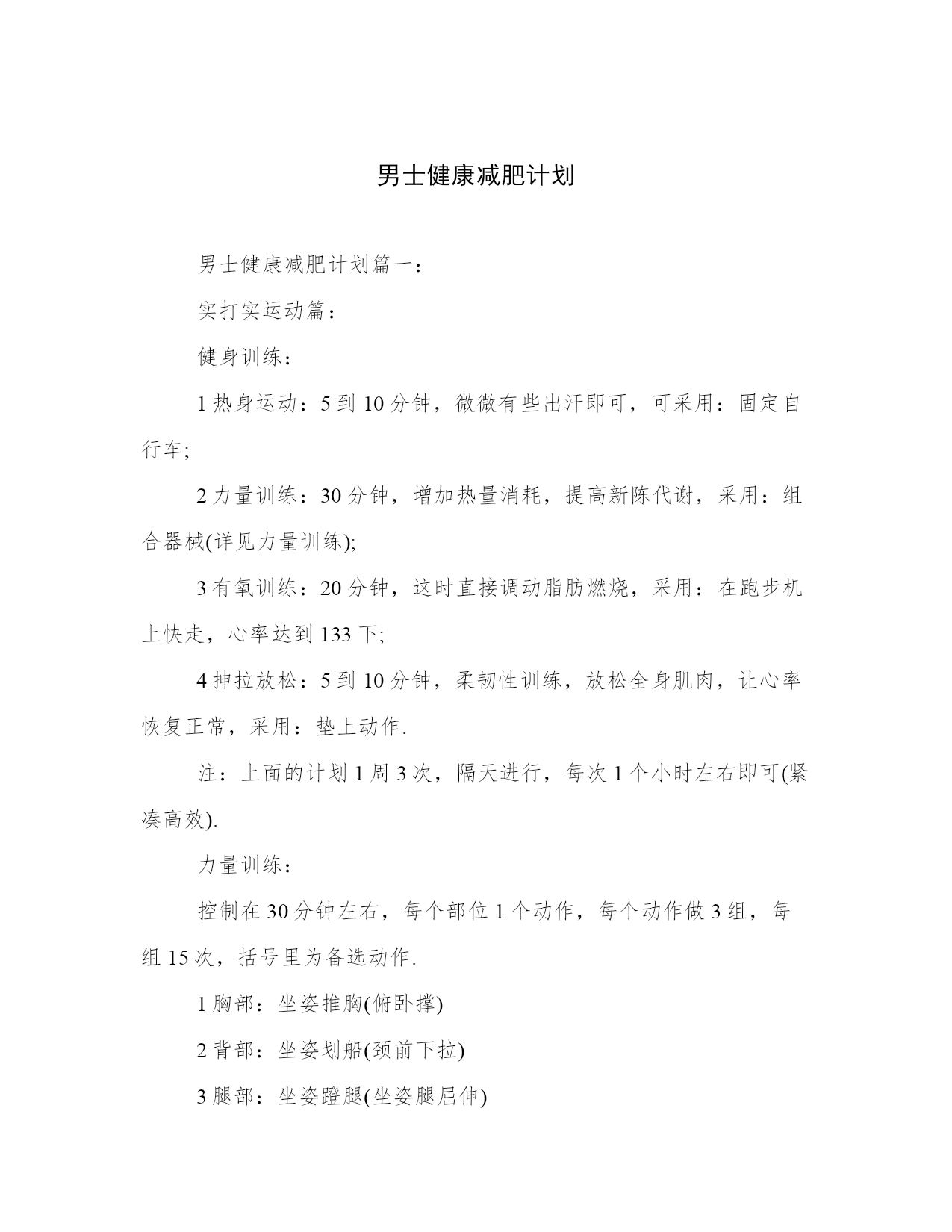 男士健康减肥计划男士健康减肥计划篇一:实打实运动篇:健身训练:1热身运动:5到10分钟,微微有些出汗即可,可采用:固定自行车;2力量训练:30分钟,增加热量消耗,提高新陈代谢,采用:组合器械(详见力量训练);3有氧训练:20分钟,这时直接调动脂肪燃烧,采用:在跑步机上快走,心率达到133下;4抻拉放松:5到10分钟,柔韧性训练,放松全身肌肉,让心率恢复正常,采用:垫上动作.注:上面的计划1周3次,隔天进行,每次1个小时左右即可(紧凑高效).力量训练:控制在30分钟左右,每个部位1个动作,每个动作做3组,每