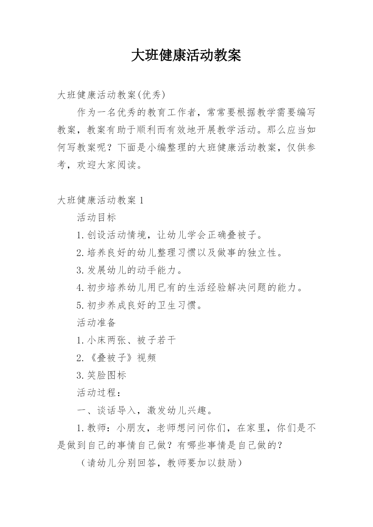 大班健康活动教案大班健康活动教案(优秀)作为一名优秀的教育工作者,常常要根据教学需要编写教案,教案有助于顺利而有效地开展教学活动。那么应当如何写教案呢?下面是小编整理的大班健康活动教案,仅供参考,欢迎大家阅读。大班健康活动教案1活动目标1.创设活动情境,让幼儿学会正确叠被子。2.培养良好的幼儿整理习惯以及做事的独立性。3.发展幼儿的动手能力。4.初步培养幼儿用已有的生活经验解决问题的能力。5.初步养成良好的卫生习惯。活动准备1.小床两张、被子若干2.《叠被子》视频3.笑脸图标活动过程:一、谈话导入,激发幼