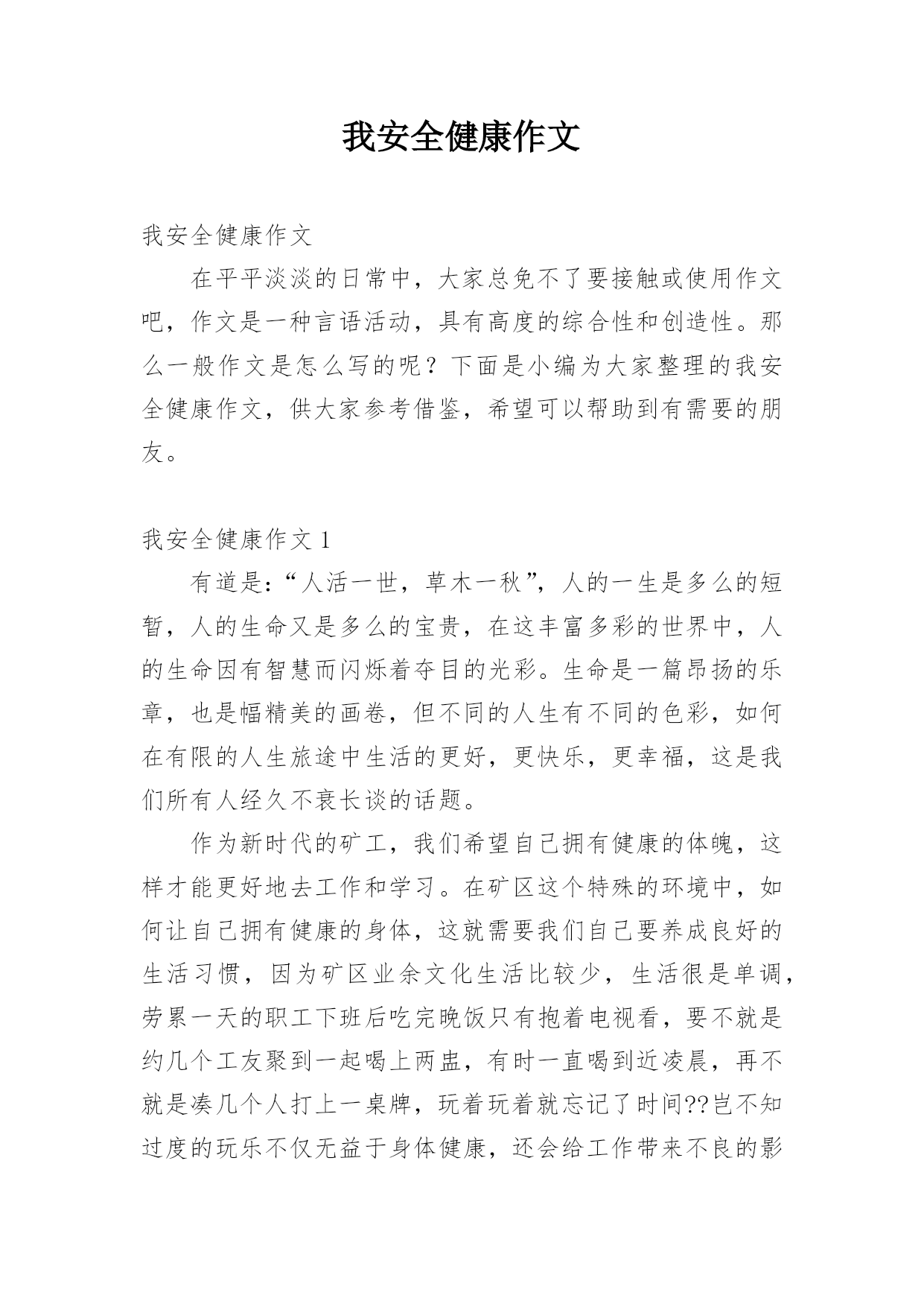 我安全健康作文我安全健康作文在平平淡淡的日常中,大家总免不了要接触或使用作文吧,作文是一种言语活动,具有高度的综合性和创造性。那么一般作文是怎么写的呢?下面是小编为大家整理的我安全健康作文,供大家参考借鉴,希望可以帮助到有需要的朋友。我安全健康作文1有道是:“人活一世,草木一秋”,人的一生是多么的短暂,人的生命又是多么的宝贵,在这丰富多彩的世界中,人的生命因有智慧而闪烁着夺目的光彩。生命是一篇昂扬的乐章,也是幅精美的画卷,但不同的人生有不同的色彩,如何在有限的人生旅途中生活的更好,更快乐,更幸福,这是我们