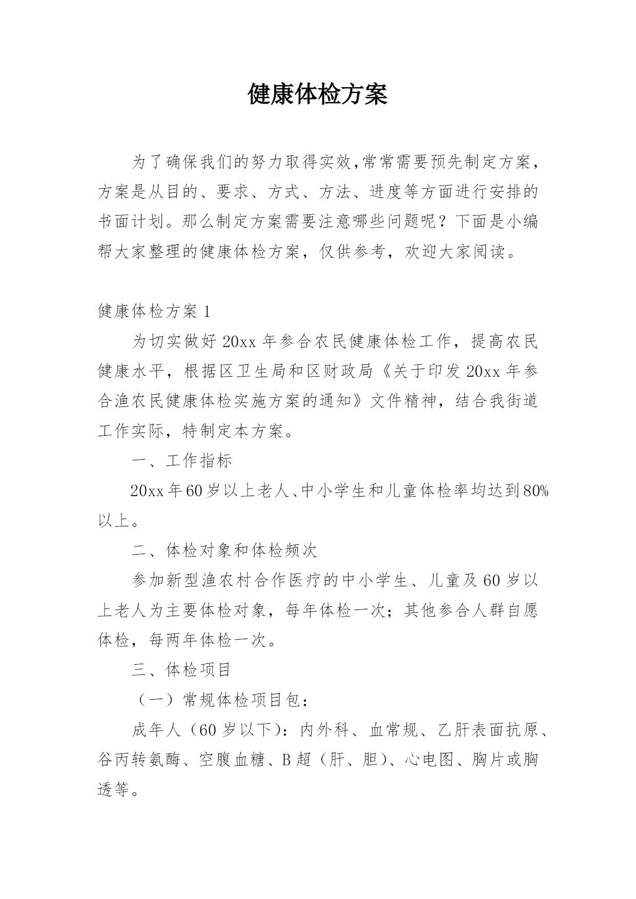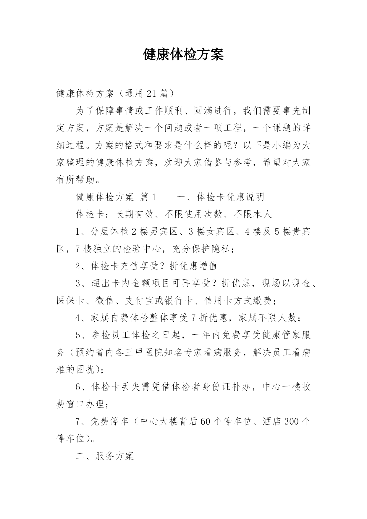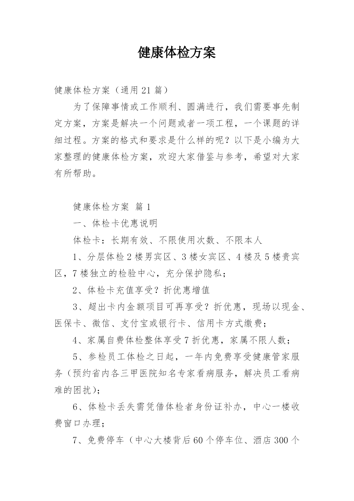 健康体检方案健康体检方案(通用21篇)为了保障事情或工作顺利、圆满进行,我们需要事先制定方案,方案是解决一个问题或者一项工程,一个课题的详细过程。方案的格式和要求是什么样的呢?以下是小编为大家整理的健康体检方案,欢迎大家借鉴与参考,希望对大家有所帮助。健康体检方案篇1一、体检卡优惠说明体检卡:长期有效、不限使用次数、不限本人1、分层体检2楼男宾区、3楼女宾区、4楼及5楼贵宾区,7楼独立的检验中心,充分保护隐私;2、体检卡充值享受?折优惠增值3、超出卡内金额项目可再享受?折优惠,现场以现金、医保卡、微信、支