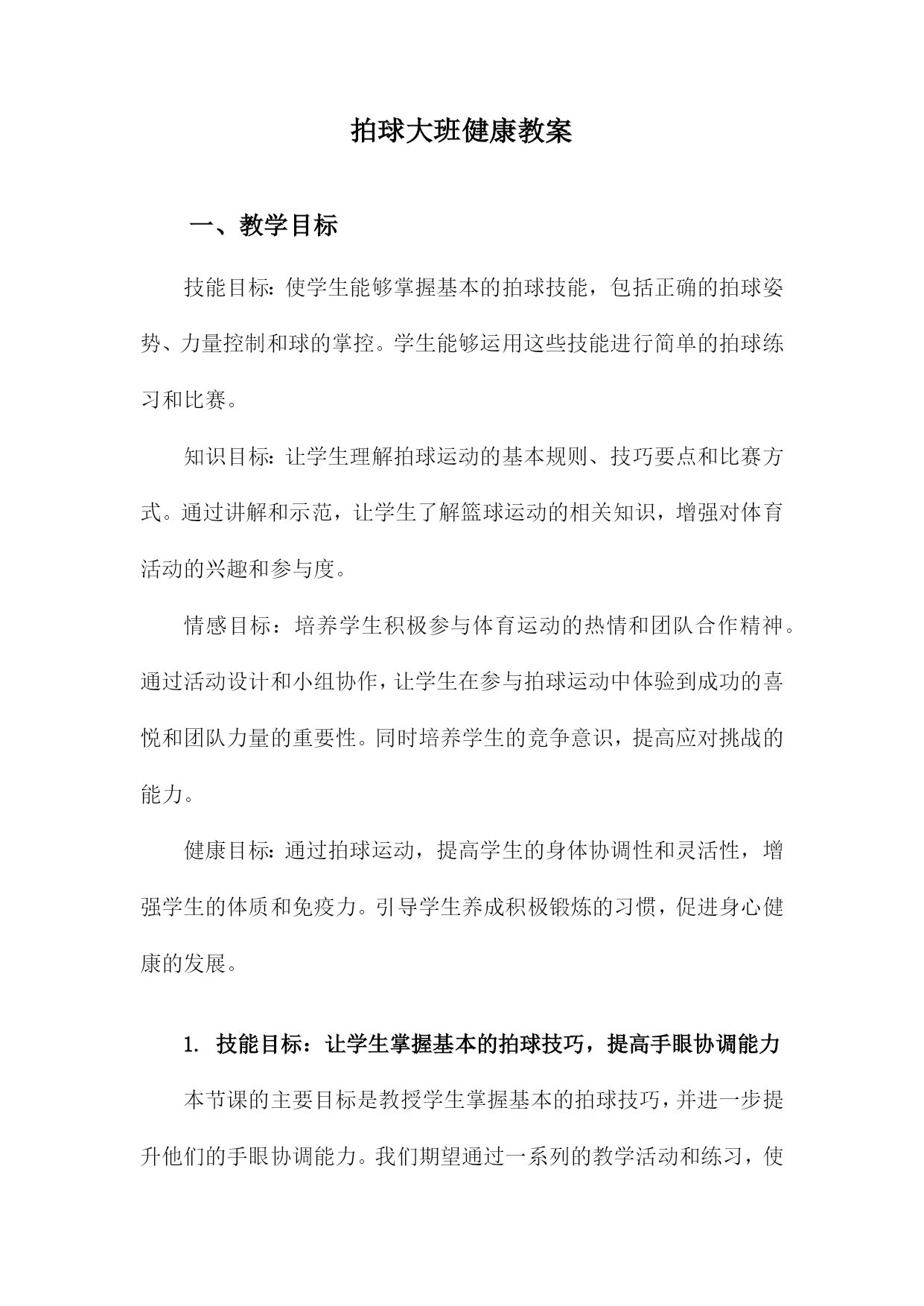 拍球大班健康教案一、教学目标技能目标:使学生能够掌握基本的拍球技能,包括正确的拍球姿势、力量控制和球的掌控。学生能够运用这些技能进行简单的拍球练习和比赛。知识目标:让学生理解拍球运动的基本规则、技巧要点和比赛方式。通过讲解和示范,让学生了解篮球运动的相关知识,增强对体育活动的兴趣和参与度。情感目标:培养学生积极参与体育运动的热情和团队合作精神。通过活动设计和小组协作,让学生在参与拍球运动中体验到成功的喜悦和团队力量的重要性。同时培养学生的竞争意识,提高应对挑战的能力。健康目标:通过拍球运动,提高学生的身体