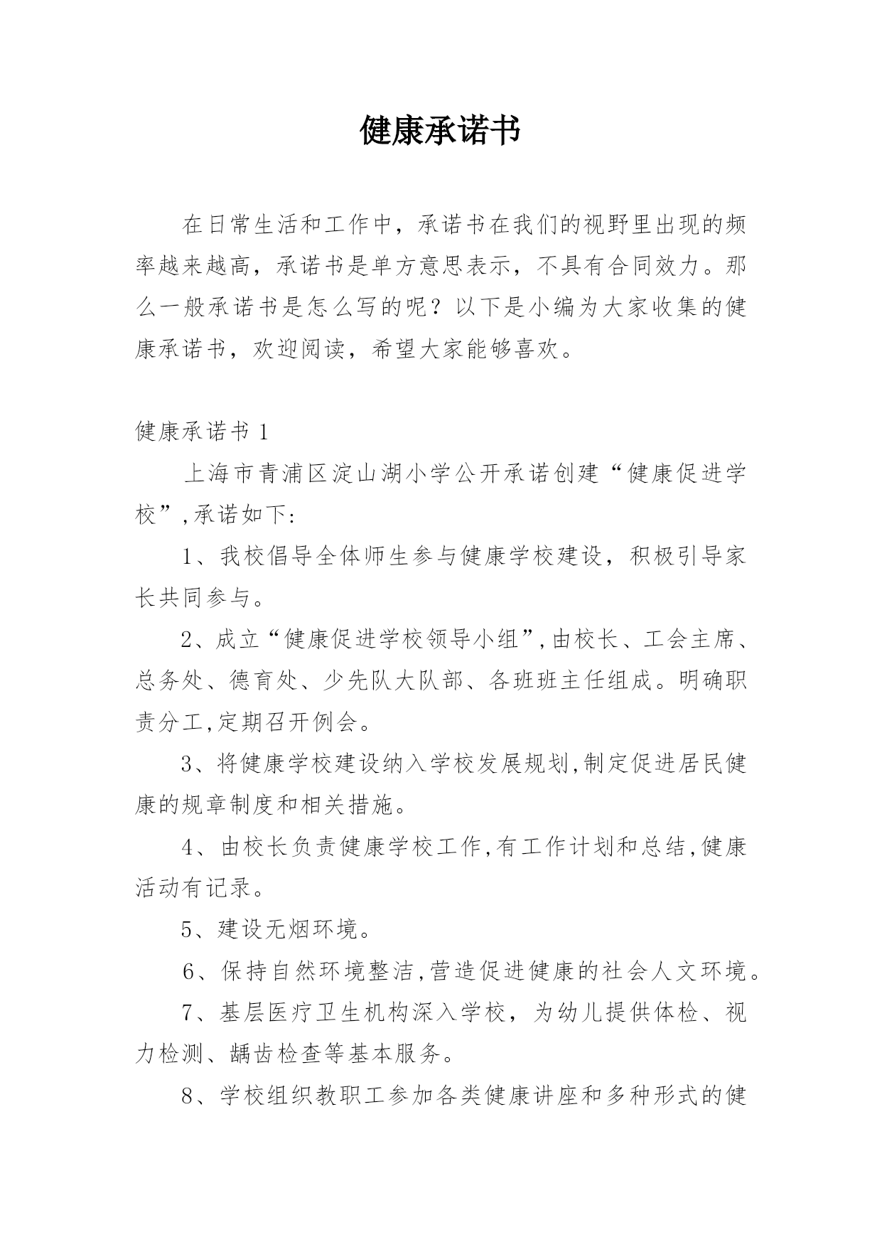 健康承诺书在日常生活和工作中,承诺书在我们的视野里出现的频率越来越高,承诺书是单方意思表示,不具有合同效力。那么一般承诺书是怎么写的呢?以下是小编为大家收集的健康承诺书,欢迎阅读,希望大家能够喜欢。健康承诺书1上海市青浦区淀山湖小学公开承诺创建“健康促进学校”,承诺如下:1、我校倡导全体师生参与健康学校建设,积极引导家长共同参与。2、成立“健康促进学校领导小组”,由校长、工会主席、总务处、德育处、少先队大队部、各班班主任组成。明确职责分工,定期召开例会。3、将健康学校建设纳入学校发展规划,制定促进居民健康
