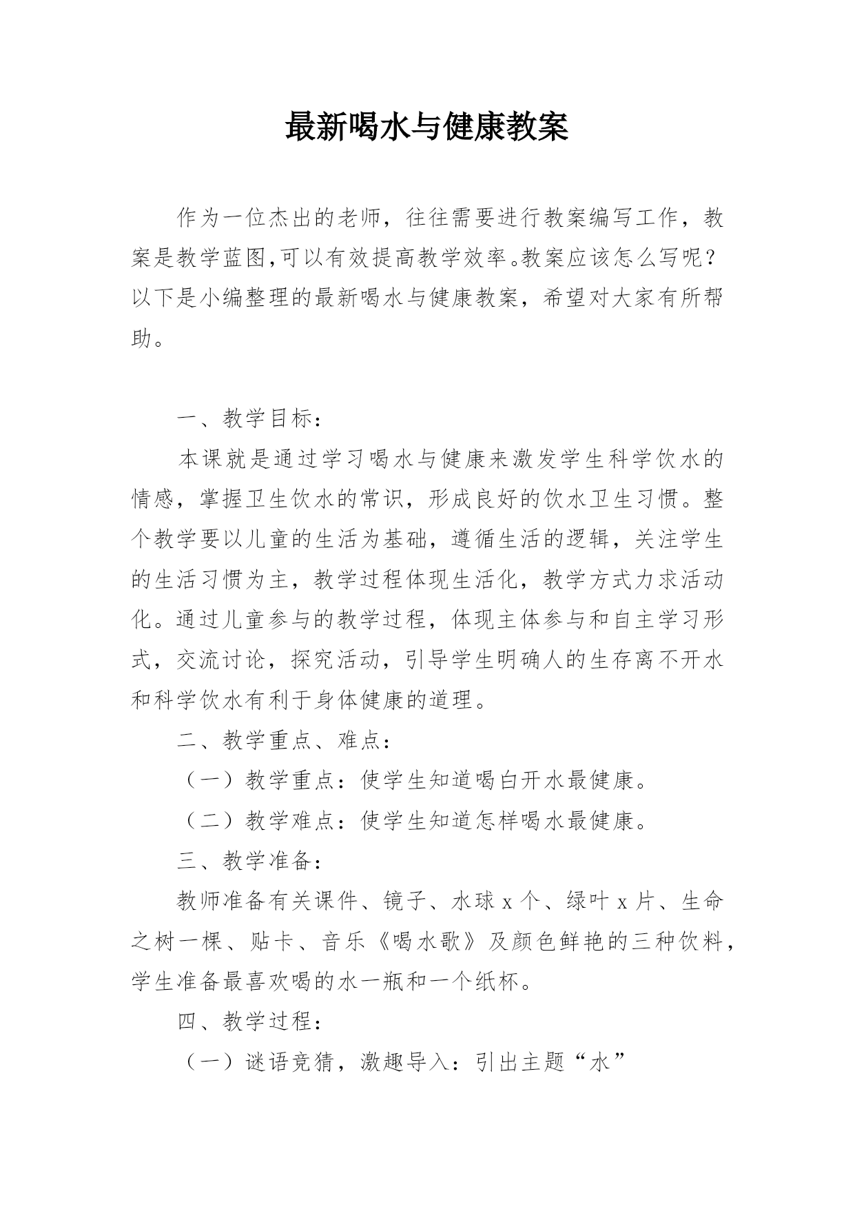 最新喝水与健康教案作为一位杰出的老师,往往需要进行教案编写工作,教案是教学蓝图,可以有效提高教学效率。教案应该怎么写呢?以下是小编整理的最新喝水与健康教案,希望对大家有所帮助。一、教学目标:本课就是通过学习喝水与健康来激发学生科学饮水的情感,掌握卫生饮水的常识,形成良好的饮水卫生习惯。整个教学要以儿童的生活为基础,遵循生活的逻辑,关注学生的生活习惯为主,教学过程体现生活化,教学方式力求活动化。通过儿童参与的教学过程,体现主体参与和自主学习形式,交流讨论,探究活动,引导学生明确人的生存离不开水和科学饮水有利